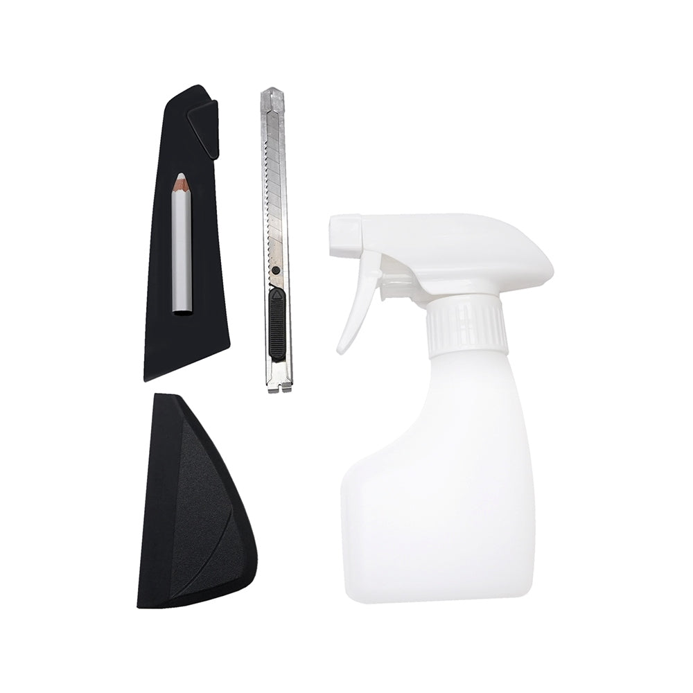 ●ガラスの洗浄・散水用ハンドスプレー/水切り・水抜き・気泡抜き・シワ伸ばし用スキージ/型取り用ダマート/フィルム裁断用カッター/仕上げの際のコーナー留め・窓枠への挿し込み用プラヘラのセットです。