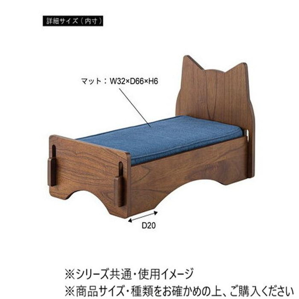 ペット専用のミニサイズのベッド ※こちらの商品は個体差がある場合がございます。ペット専用のミニサイズのベッド。猫モチーフのブラウンカラーは木目が映える素朴で可愛らしいデザインです。工具不要の簡単組立式。マットレスで使用しているデニム生地は取り外しが可能になっております。脚裏にはフェルトが付いているので、床への傷防止にもなり安心です。仕様:カバーリング、組立式