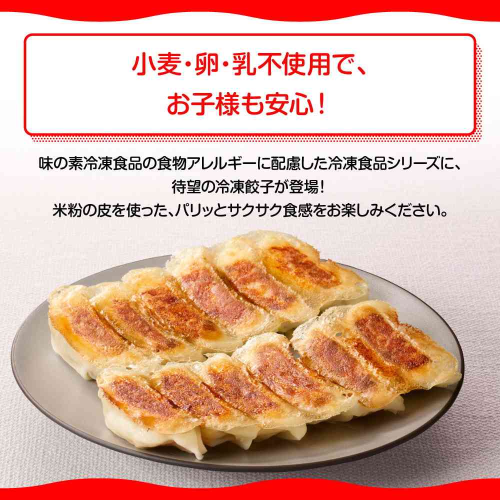 小麦卵乳の3大アレルゲン不使用で、すべて国産のお肉と野菜を使用した、油水なしで焼ける米粉でつくったギョーザです。