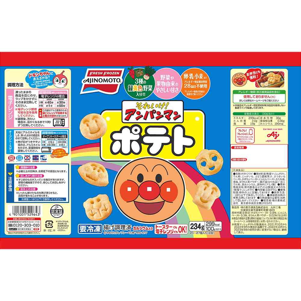 マッシュポテトにじゃがいも、さつまいも、3種の緑黄色野菜、カルシウムを加えたポテトスナックです。