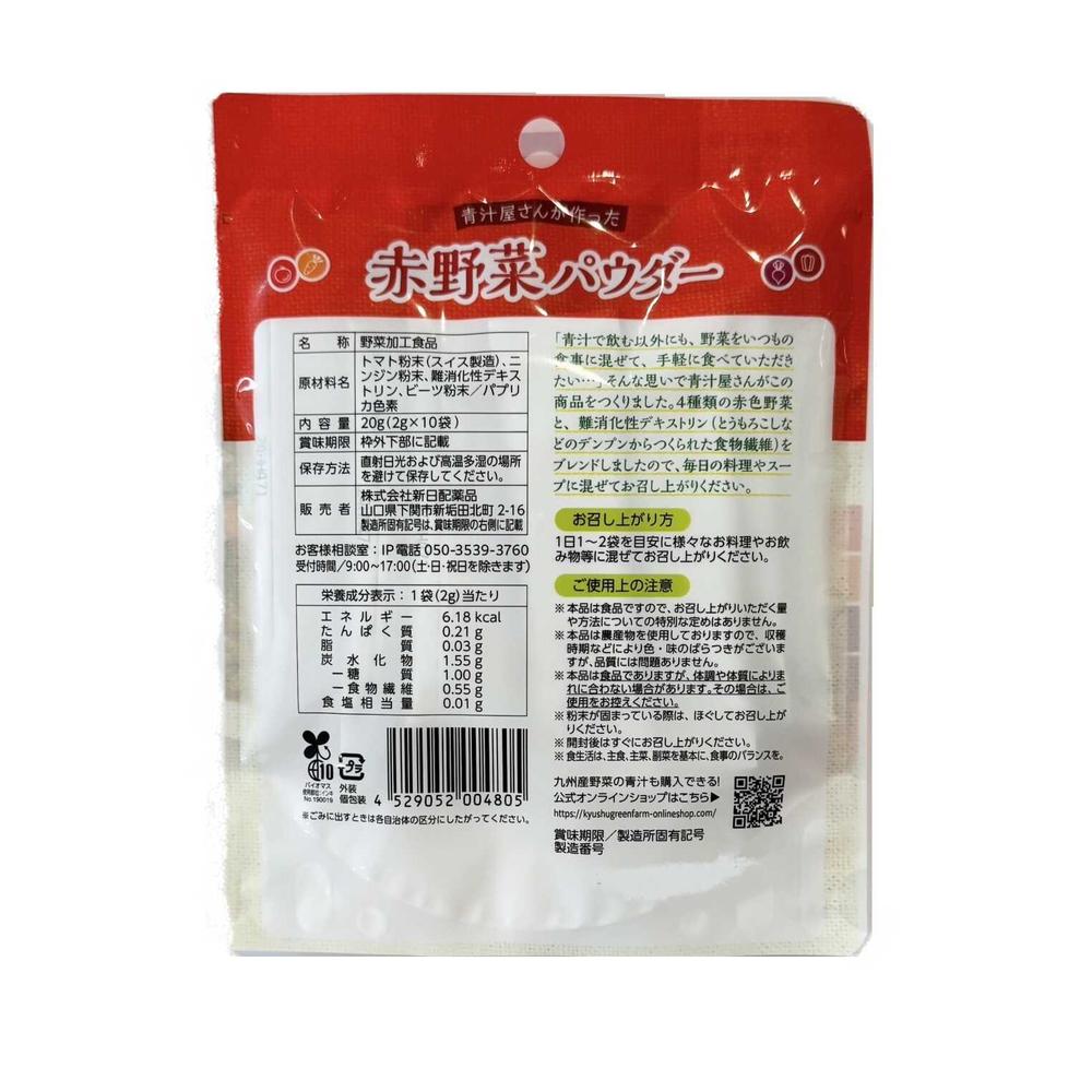 4種類の赤色野菜(トマト、ニンジン、ビーツ、赤パプリカ)のパウダーと難消化性デキストリンをブレンドした野菜パウダーです。