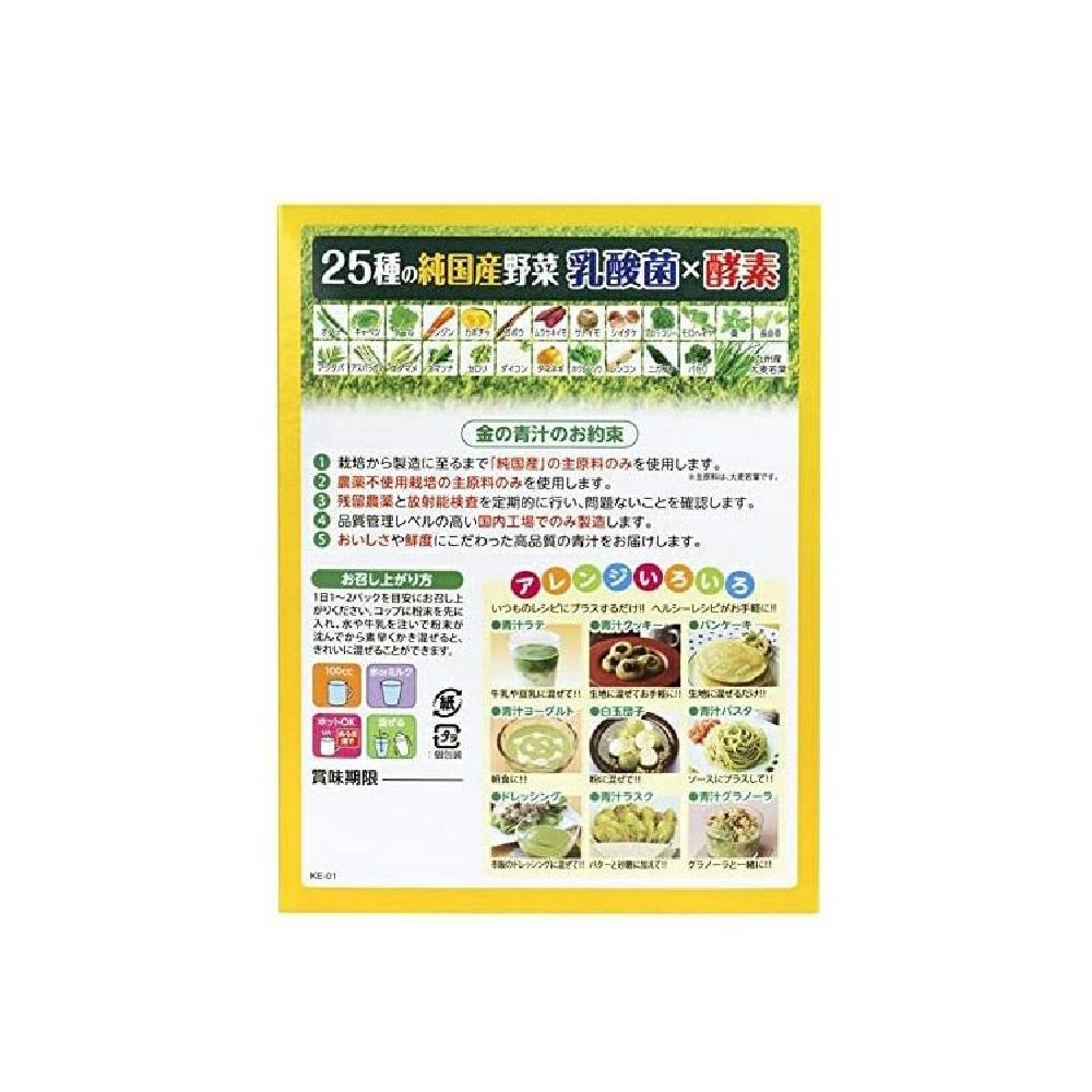 大麦若葉粉末(九州産)、水溶性食物繊維、還元麦芽糖、ケール粉末、黒糖、澱粉、パパイヤ抽出物、殺菌乳酸菌末(乳成分を含む)、野菜粉末(オクラ、キャベツ、ケール、ニンジン、カボチャ、ゴボウ、サツマイモ、サトイモ、シイタケ、ブロッコリー、アシタバ、アスパラガス、エダマメ、コマツナ、セロリ、ダイコン、ダイコン葉、タマネギ、パセリ、ホウレンソウ、レモン、レンコン)、桑葉粉末、ニガウリ粉末、モロヘイヤ粉末、ボタンボウフウ(長命草)粉末、きな粉(大豆を含む)