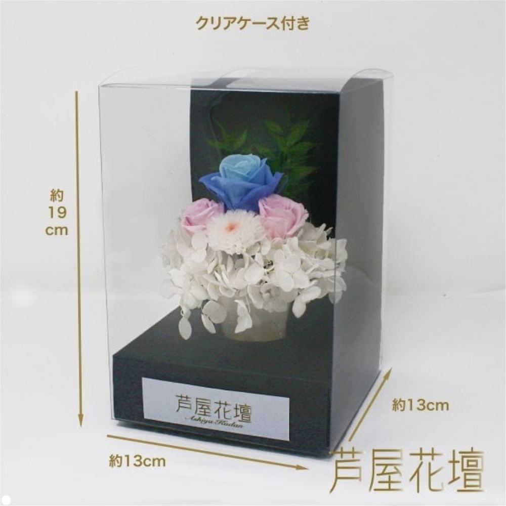 ギフトやプレゼントに人気のプリザーブドフラワーです。プリザーブドフラワーのため水やり、お手入れがいりません。長期間美しい状態のままです。インテリアなどで飾れます。全て天然素材のものを使用。造花は一切使用しておりません。プリザーブド加工(自然のお花や木に特殊な液体を吸わせたりすることで長持ちさせる加工)を施しているので、長く楽しむことができます。クリアケースに入っているのでホコリをかぶる心配もいりません。ひとつひとつハンドメイド製作。花材の自然な生かして製作しています。A&K社の商品は全て天然素材の花材を使用し、一切造花は使用しておりません。また、全ての商品をハンドメイド(手作り)で行っています。国産品、国内製造にこだわりを持った商品です。