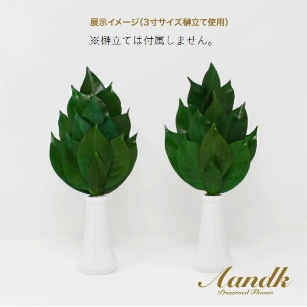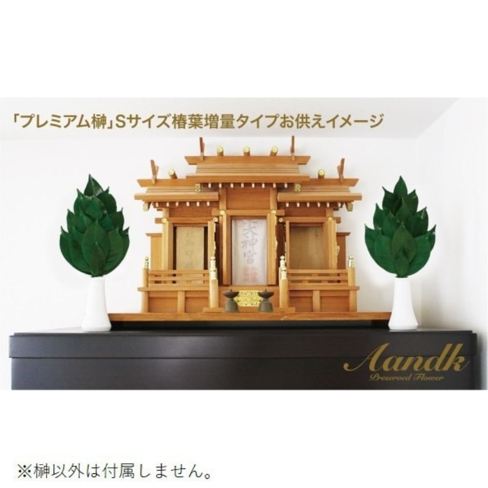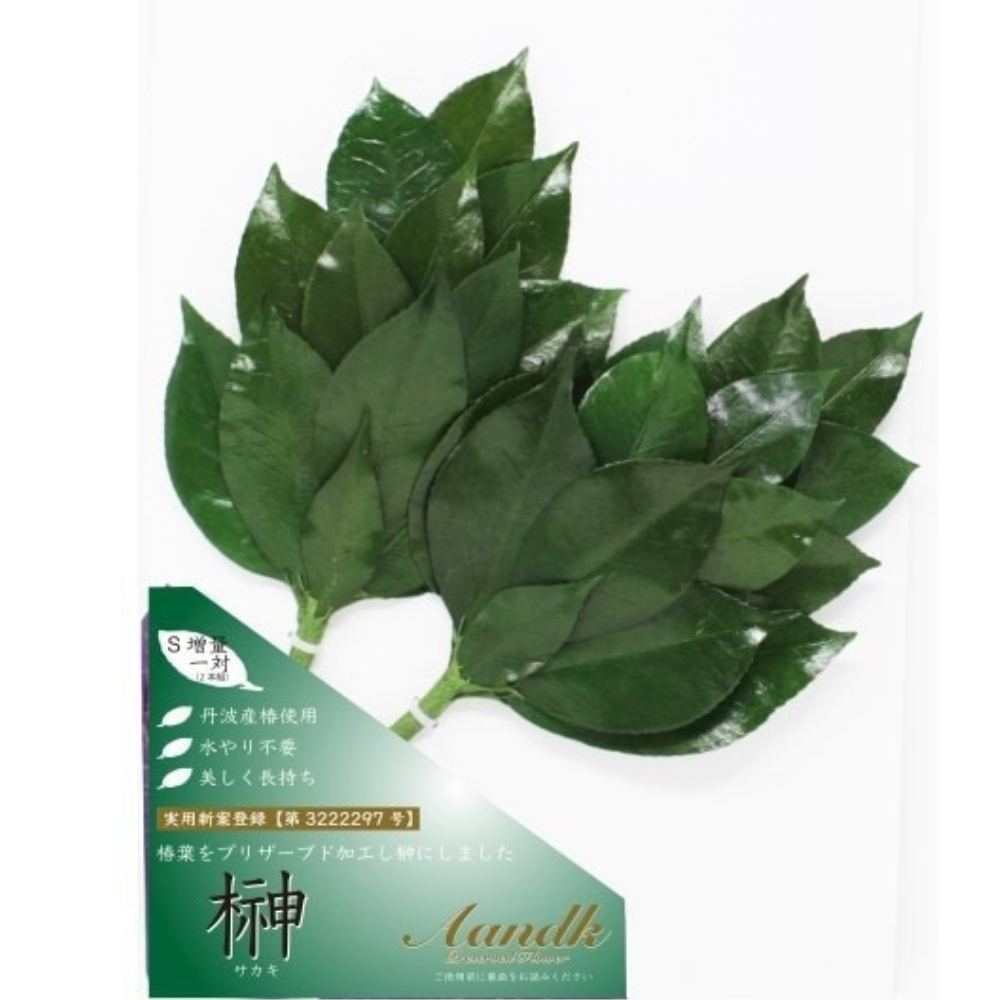丹波産の高級椿葉をプリザーブド加工(生木に無害な薬品・着色料で特殊加工)し、1枚1枚ていねいに編み込んで製作した榊です。一対(2本組)セット。椿葉を増量し、よりボリューム感を出しました。3寸の榊立てに最適なSサイズ。実用新案登録済。第3222297号水やり不要、美しく長持ち。危険を伴う高所の神棚での榊交換や水替えが不要です。水やりが不要なので、水が腐るニオイもなく清潔。生の榊を供え続けた場合のコストは年間約2万円。一度限りの購入で済みます。天然の椿葉を使っているので神様にためらうことなくお供えできます。天然のお花や葉に無害な薬品・着色料で特殊加工し、生葉と変わらない外観を保ちながら、長期間の保存を可能にした加工技術です。当製品は国内加工ですので、外国産にありがちな、枯れる、葉が丸まる、しおれるということがほとんどなく、適した環境に保管できれば3年以上美しい状態を保てます