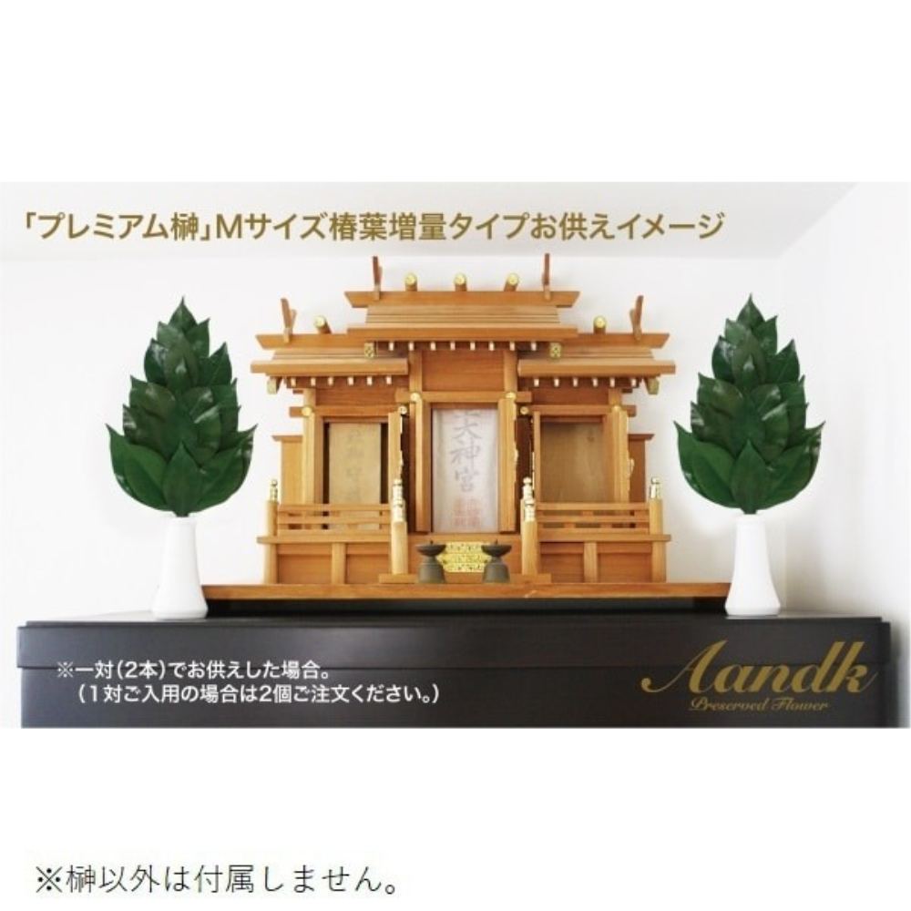 丹波産の高級椿葉をプリザーブド加工(生木に無害な薬品・着色料で特殊加工)し、1枚1枚ていねいに編み込んで製作した榊です。椿葉を増量し、よりボリューム感を出しました。3.5寸の榊立てに最適なMサイズ1束。実用新案登録済。第3222297号水やり不要、美しく長持ち。ご年配の方へ贈り物に!危険を伴う高所の神棚での榊交換や水替えが不要です。水やりが不要なので、水が腐るニオイもなく清潔。交換費用と手間を節約!生の榊を供え続けた場合のコストは年間約2万円。一度限りの購入で済みます。造花ではありません!天然の椿葉を使っているので神様にためらうことなくお供えできます。