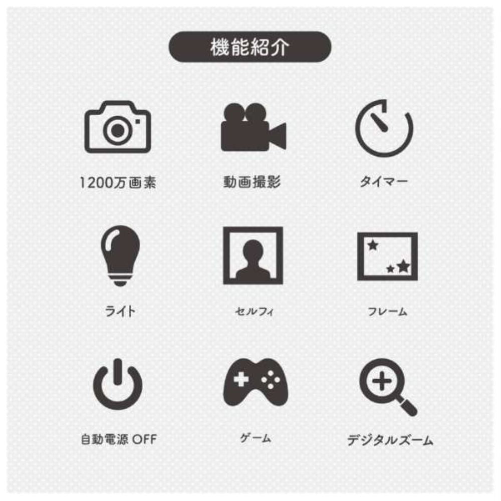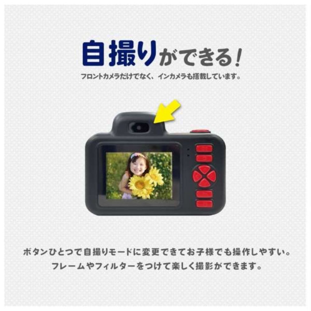 レンズリングを回してズームができる本格派トイカメラです!動画もゲームもできます!最大3200万画素で高画質撮影ができる子ども向けデジタルカメラです。オートフォーカスやスマイル認識機能を搭載し、自撮りができるインカメラも装備。プリクラ風のフレーム撮影やタイマー機能、ライト撮影など遊べる機能も充実しています。USB充電式で、充電時間は約2.5時間。軽量設計(約80g)で小さな手でも持ちやすく、32GBまでのmicroSDカードに対応。素材はABS樹脂製で、ボタン部分はシリコン製です。