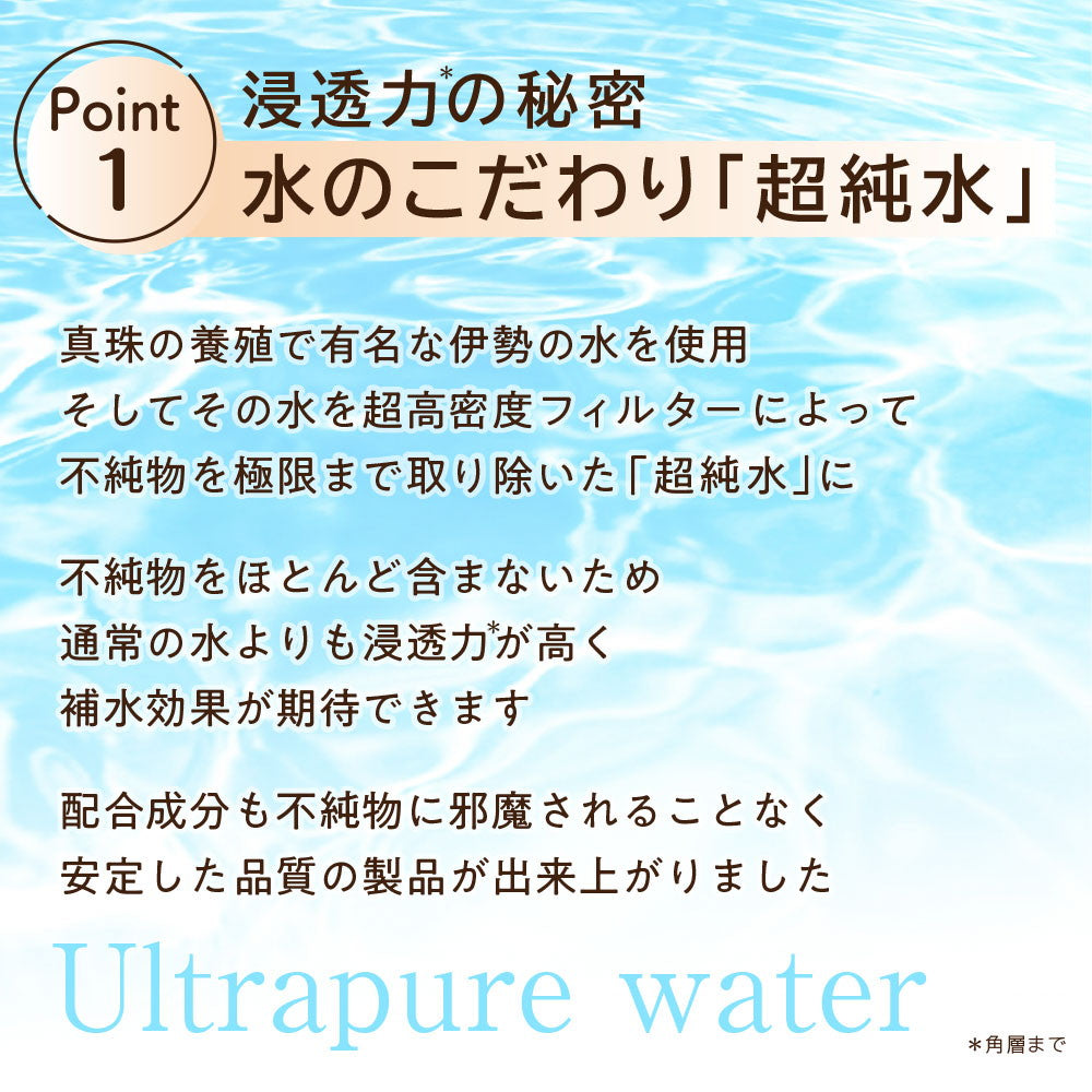 肌に届けるものだから水にもこだわり、超高密度フィルターによって不純物を極限まで取り除いた「超純水」を使用しています。