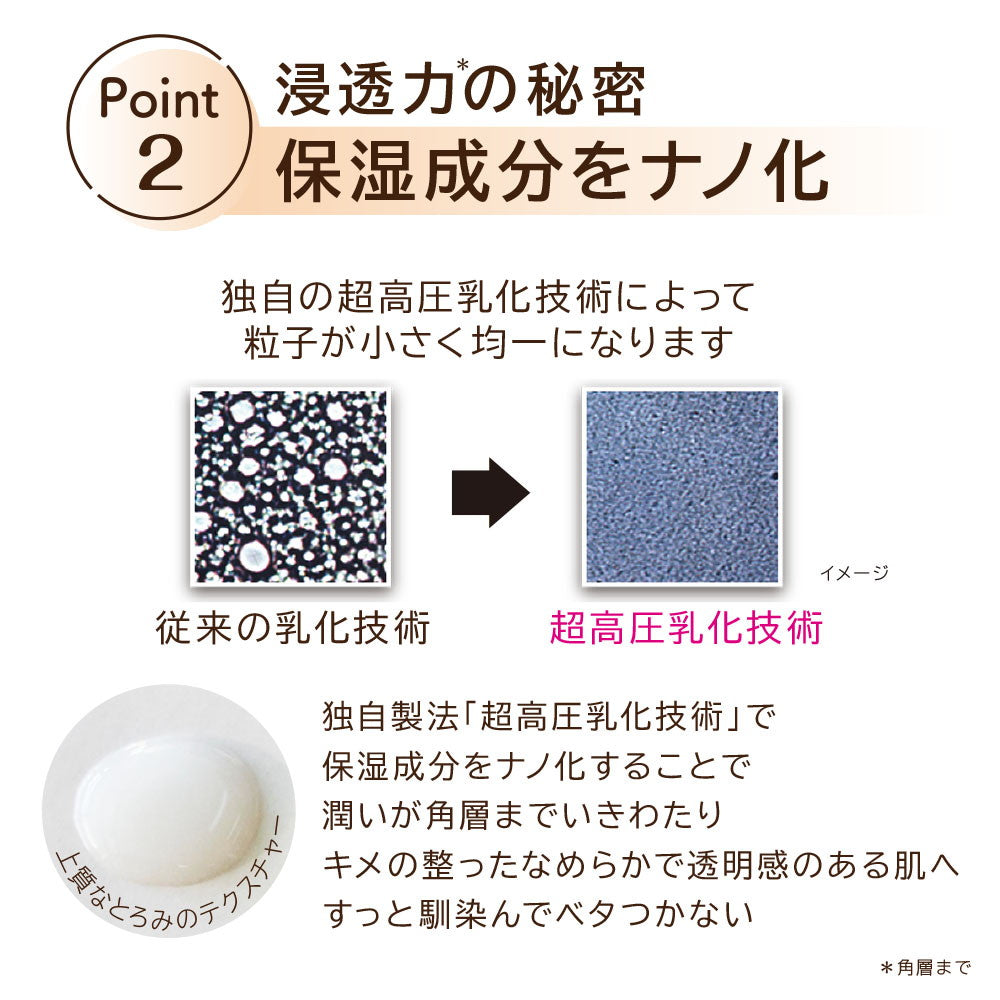 独自の超高圧乳化技術で保湿成分をナノレベルまで均一に微粒子化することで肌にのせたときの心地良いなめらかさと、角層のすみずみまでいきわたる浸透力を実現しました。