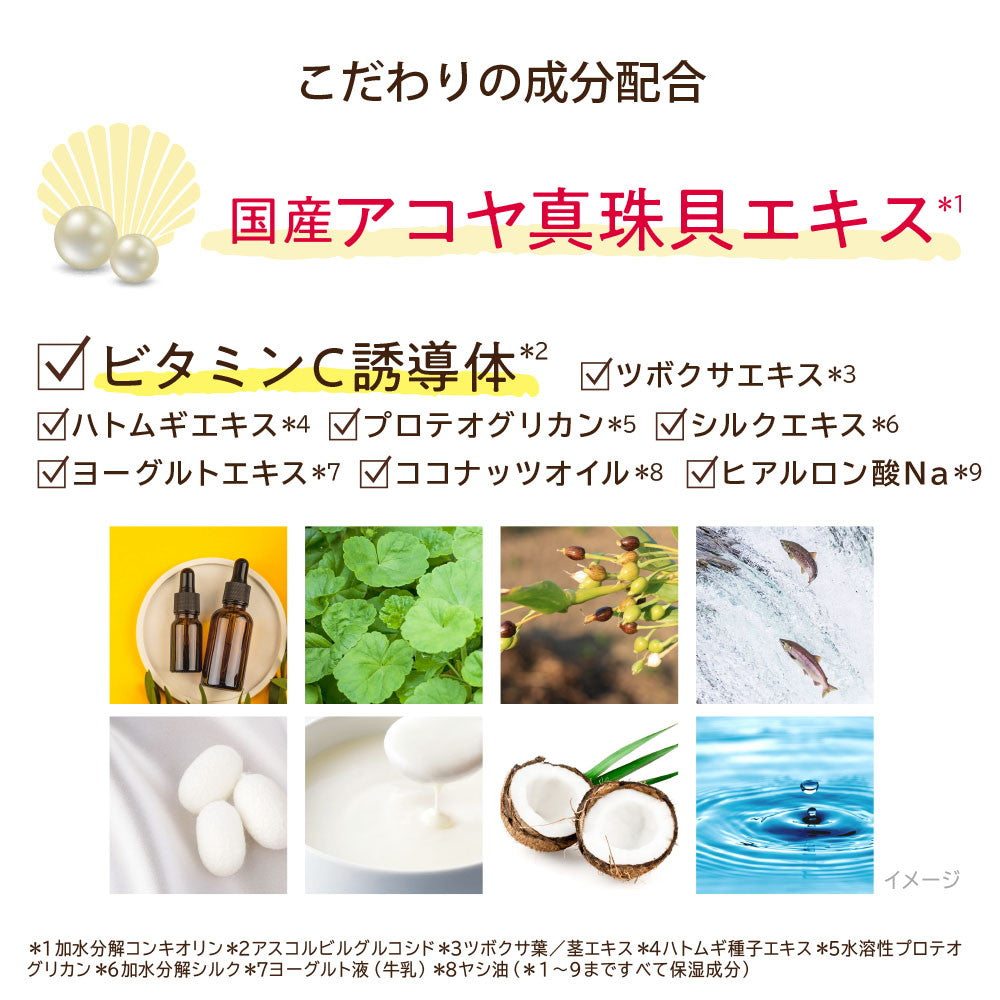 国産アコヤ真珠貝エキスやシルクエキス、ヨーグルトエキス(乳酸菌)、ビタミンC誘導体、ツボクサエキスなどあらゆる悩みにアプローチできる厳選した保湿成分配合で肌のキメを整え、潤いと透明感のある肌へ導きます。