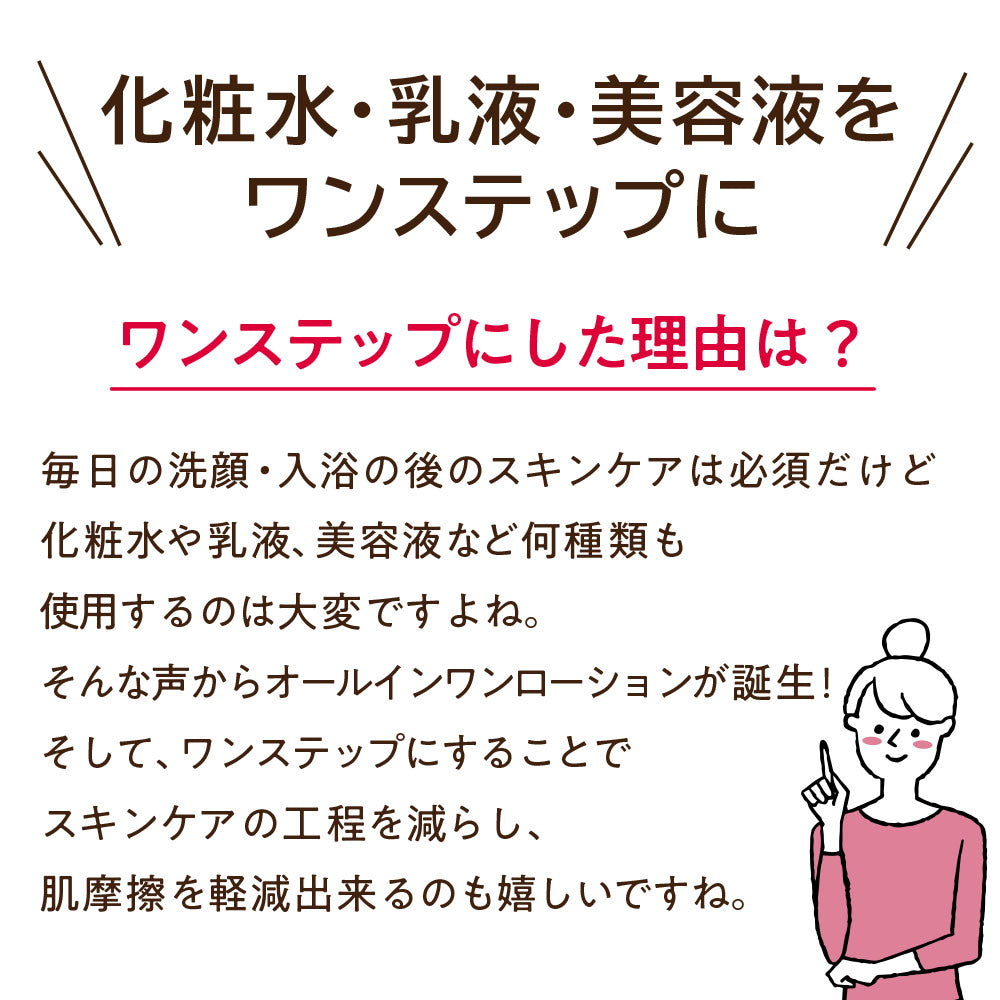 化粧水、乳液、美容液までのステップをひとつにすることでスキンケアの工程をシンプルに、肌の潤いを補い保ちます。