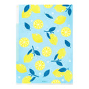 爽やかなブルーの背景に手書き風のレモンが散りばめられた、かわいらしいデザインです。