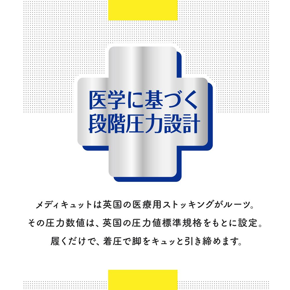 ■メディキュットのキュットアップ製法 (1)段階圧力設計 横に編みこんだインレイ糸によって、安定した段階圧力値を実現。効果的に脚をひきしめます。(2)やわから素材使用 コットンフィール素材でしっかりした着圧とやわらかな肌ざわりの両方を実現。