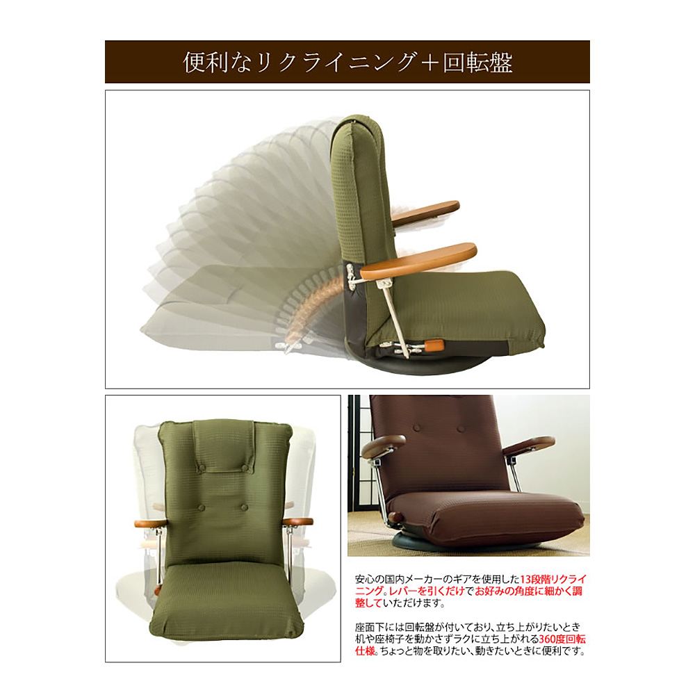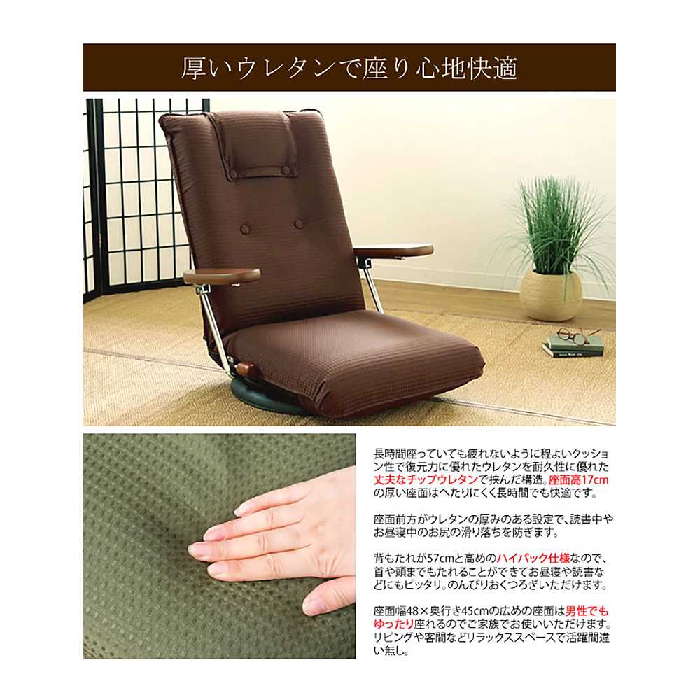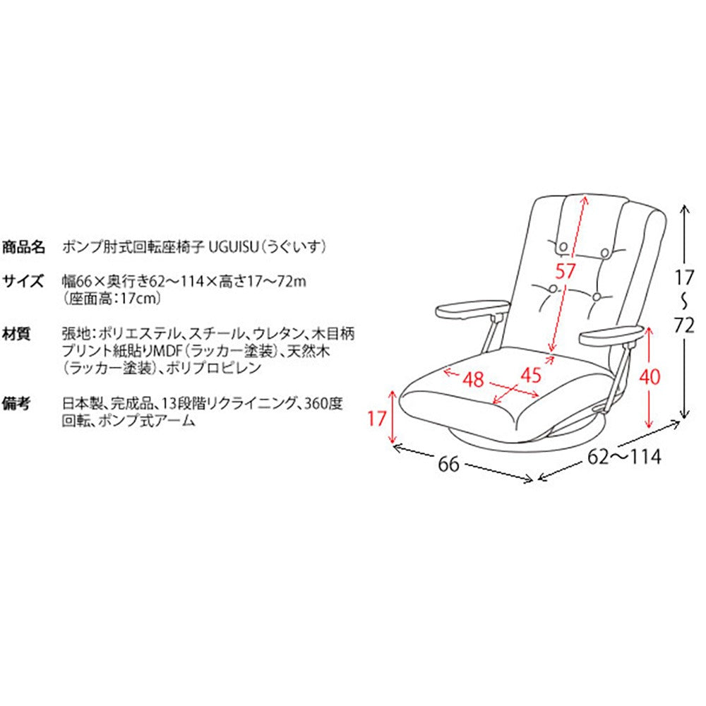 簡単に跳ね上がるポンプ式の肘置きがついた、落ち着きのあるベーシックな日本製座椅子『UGUISU(うぐいす)』。