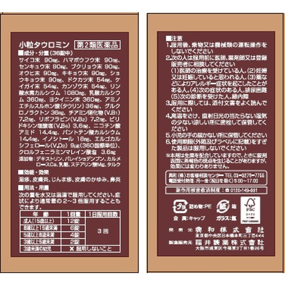 36錠中:サイコ末 90mg、ハマボウフウ末 90mg、センキュウ末 90mg、ブクリョウ末 90mg、オウヒ末 90mg、キキョウ末 90mg、ショウキョウ末 90mg、ドクカツ末 54mg、ケイガイ末 54mg、カンゾウ末 54mg、リン酸水素カルシウム 1080mg、乳酸カルシウム 360mg、ヨクイニン末 360mg、アミノエチルスルホン酸(タウリン) 36mg、グルクロノラクトン 36mg、チアミン硝化物 7.2mg、リボフラビン 7.2mg、ピリドキシン塩酸塩 3.6mg、ニコチン酸アミド 14.4mg、パントテン酸カルシウム 14.4mg、イノシトール 18mg、エルゴカルシフェロール 9μg (360 I.U.)、クロルフェニラミンマレイン酸塩 3.6mg