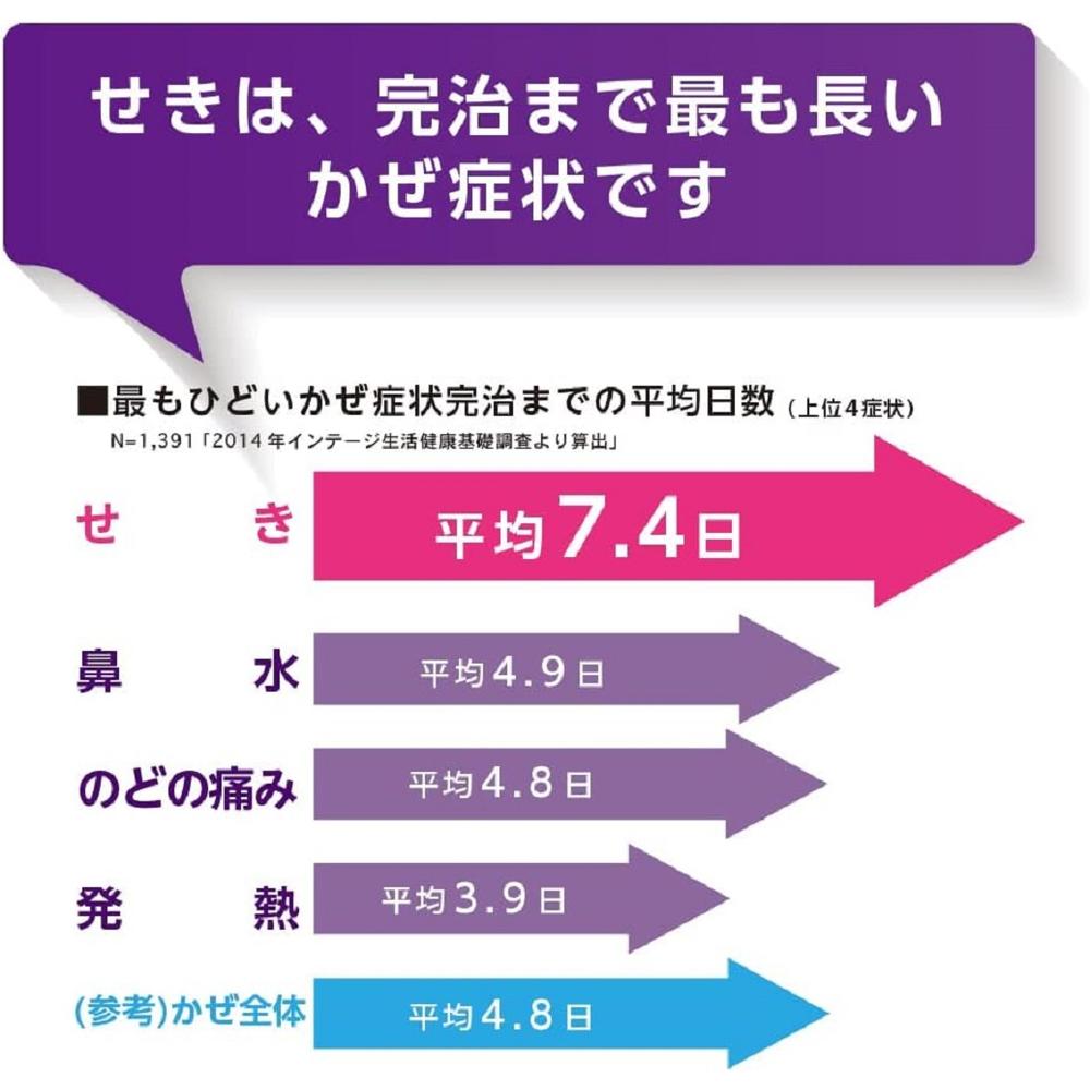 ・咳が続くと体力を消耗します。よって、無理せず、休養と栄養も心がけましょう。マスクをすると楽になることも多いので、お試し下さい。また、長引く場合は過量服用・長期連用せず、早めに受診することをお勧めします。 ・お使いになって何か気になる症状が出た場合は、使用を中止し、医師・薬剤師・登録販売者にご相談下さい。 ・使用前に、よく添付文書をお読みになってからご使用下さい。その際、ご不明な点がございましたら、薬剤師・登録販売者にご相談下さい。4987107618139