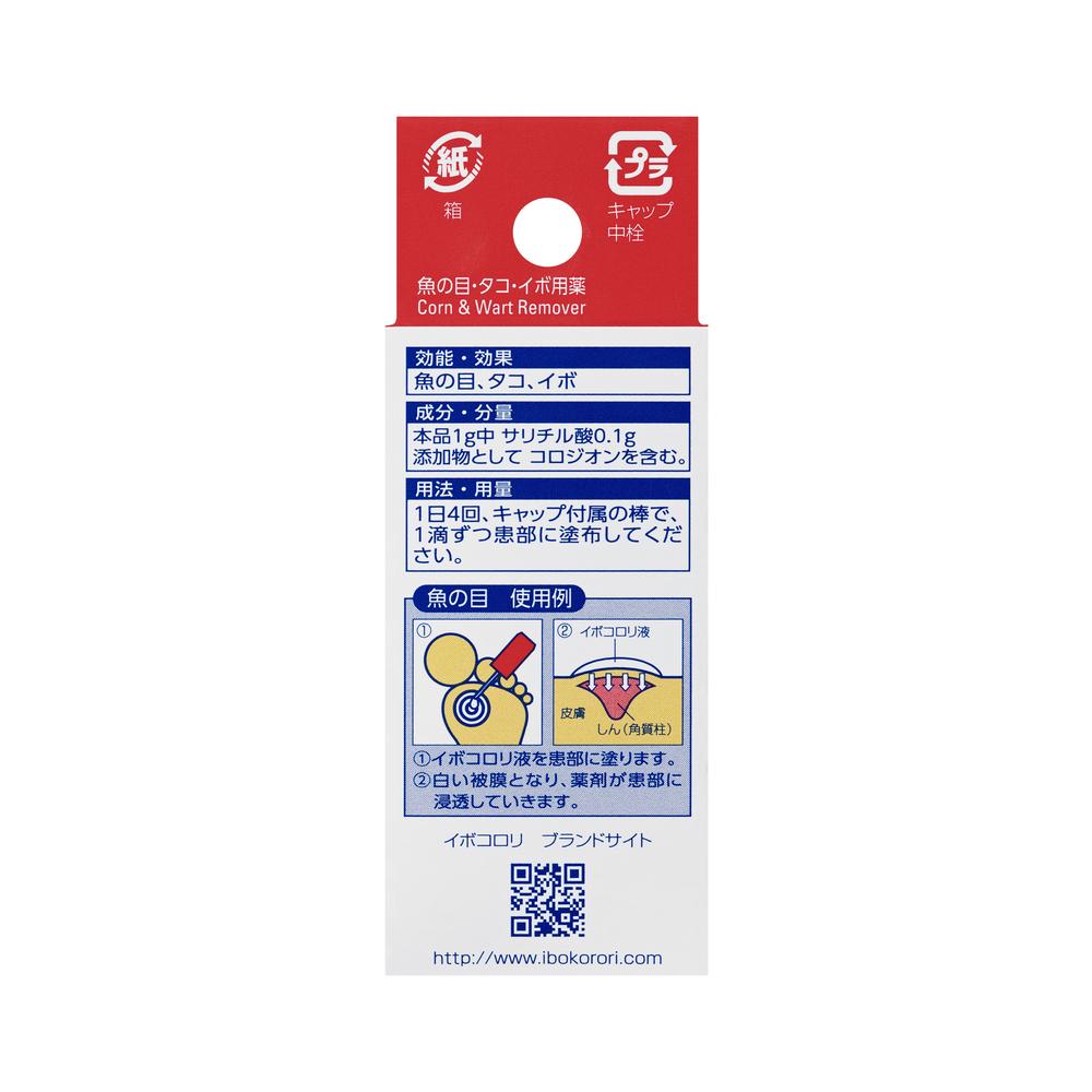 患部に塗布するとすばやく乾燥し、白い被膜をつくり、厚く硬くなった皮膚をやわらかくし、魚の目・タコ・イボを取り除きます。