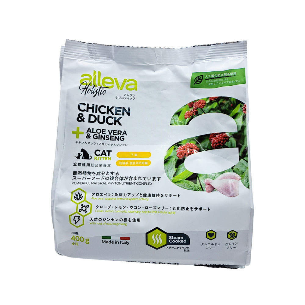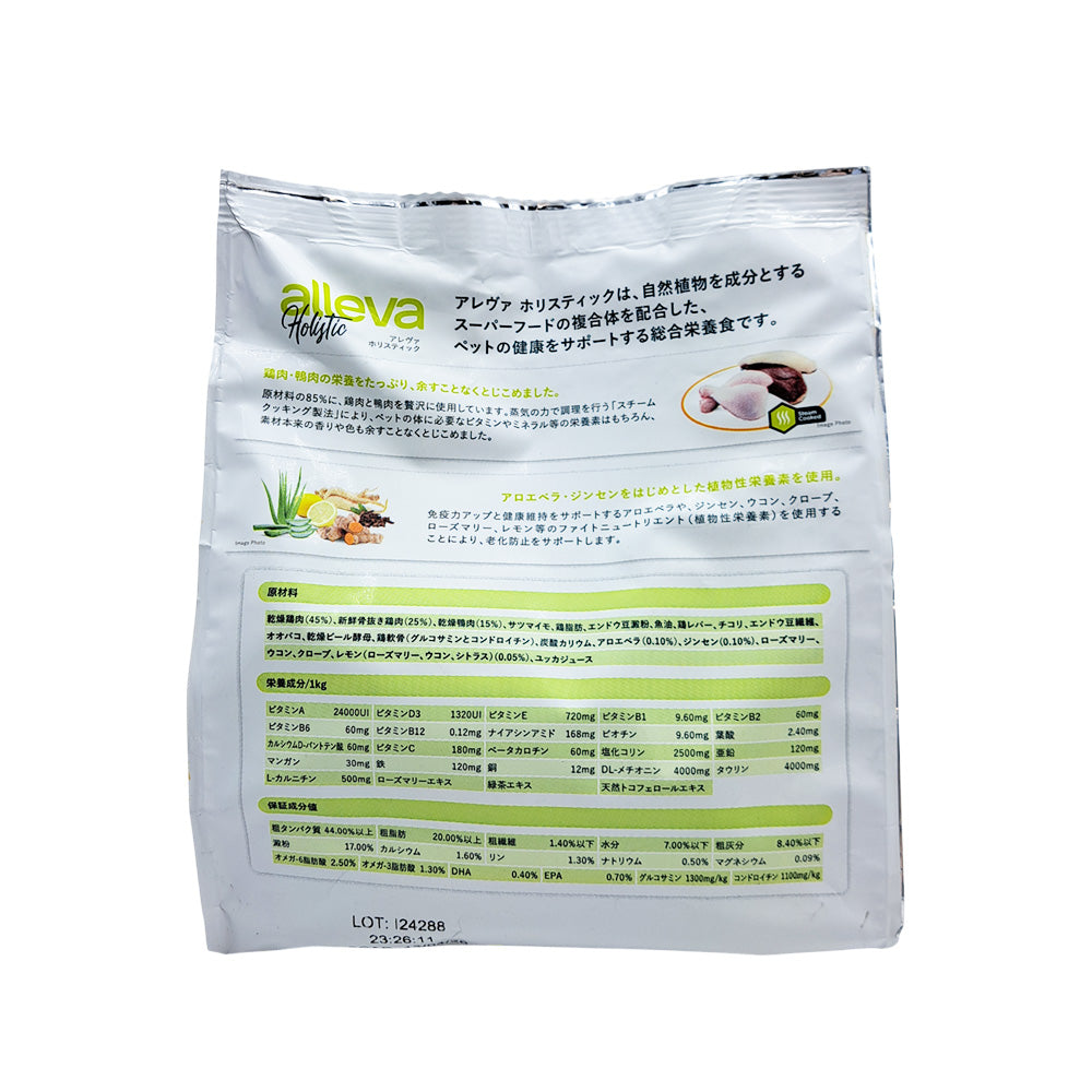 乾燥鶏肉(45%)、新鮮骨抜き鶏肉(20%)、乾燥カモ肉(12%)、サツマイモ、鶏脂肪、エンドウ豆デンプン、ニシン油、鶏レバー、チコリ根、エンドウ豆繊維、オオバコ、乾燥ビール酵母、鶏軟骨、炭酸カリウム、アロエベラ(0.10%)、高麗人参(0.10%)、ローズマリー、ウコン、クローブ、レモン(0.05%)、ユッカジュース