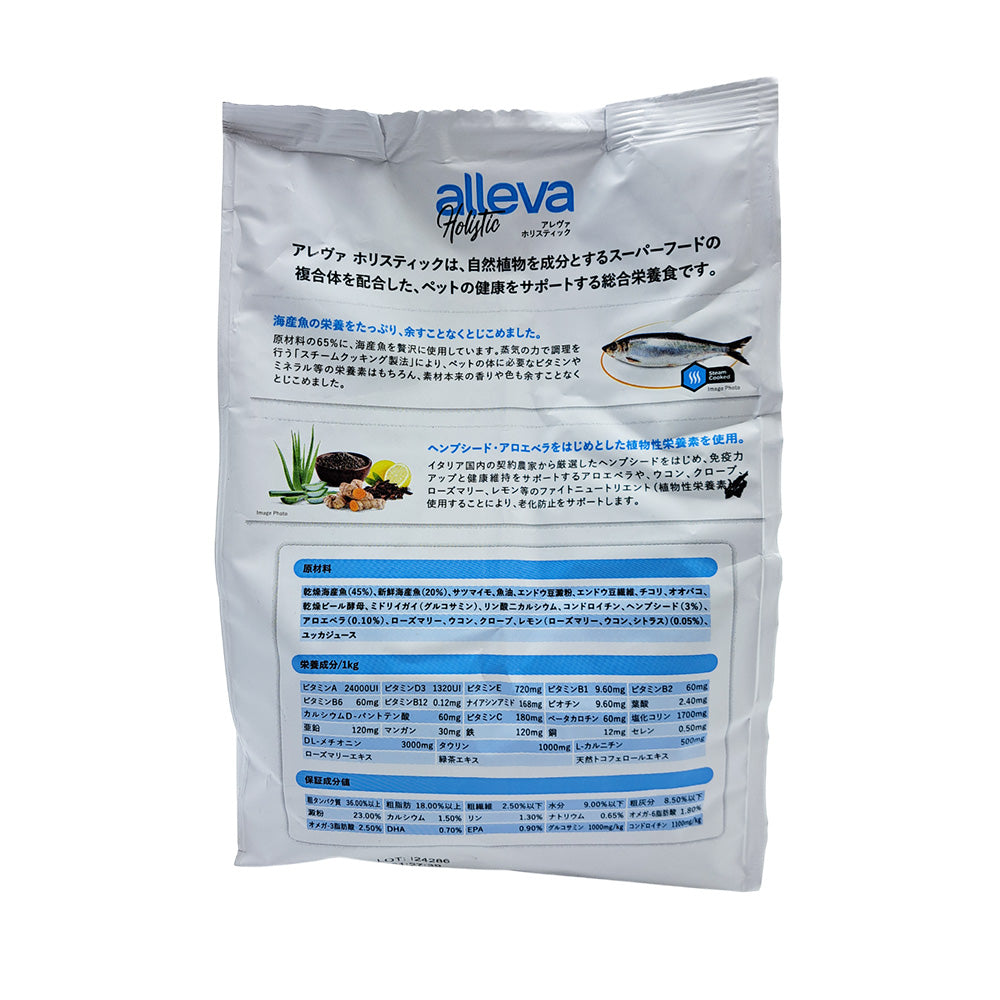 乾燥ニシン(45%)、新鮮ニシン(20%)、サツマイモ、ニシン油、エンドウ豆デンプン、ヘンプシード(3%)、エンドウ豆繊維、チコリ根、オオバコ、乾燥ビール酵母、ミドリイガイ、炭酸カルシウム、コンドロイチン硫酸、アロエベラ(0.10%)、ローズマリー、ウコン、クローブ、レモン(0.05%)、ユッカジュース