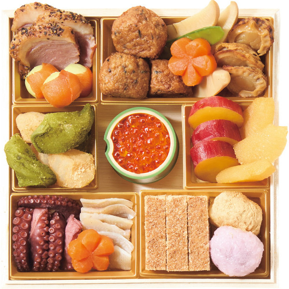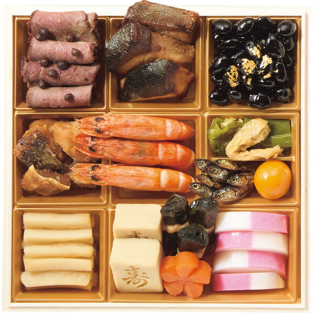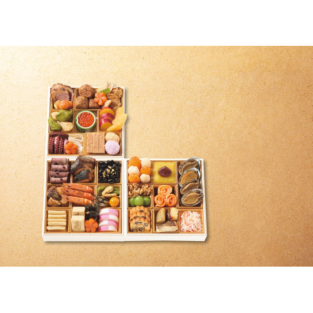 ●お重サイズ=約20.2×20.2×5.6(三段16.8)cm●重箱盛付済商品●白木製重箱入[賞味期限:冷凍保存2026年1月31日/解凍したおせち料理は、お早目にお召し上がりください。]※解凍方法:冷蔵庫/約24時間●<一の重>13品目:ローストビーフ有馬山椒のせ、鰤照焼、金箔黒豆煮、真鱈旨煮、焼車海老、万願寺唐辛子とお揚げの炊いたん、田作り、金柑甘露煮、たたきごぼう、寿高野豆腐、紅白かまぼこ、ひと口昆布巻、梅人参<二の重>13品目:いか松笠白焼、いか松笠雲丹焼、きんとん、渋皮栗、松前漬、あわび、胡桃飴煮、若桃甘露煮、わかめ、サーモンローズ、黒豆入り伊達巻、烏鰈西京焼、紅白なます<三の重>16品目:合鴨パストラミ、手毬サーモンチーズ、飛龍頭、穂先竹の子煮、きぬさや、焼帆立、きなこわらび餅、抹茶わらび餅、いくら醤油漬、さつまいもレモン風味煮、数の子、真蛸足生姜煮、小鯛笹漬、鶏松風、きなこおはぎ、桜小餅●3~4人前●42品●限定数●温度帯:冷凍●商品お届け日:12月29日(月)