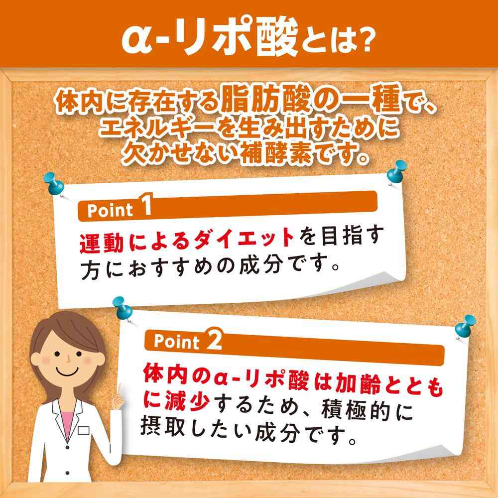 チオクト酸(α−リポ酸)(国内製造)、食用精製加工油脂/シクロデキストリン、ゼラチン、微粒二酸化ケイ素、酸化防止剤(抽出ビタミンE)、着色料(カラメル、酸化チタン)