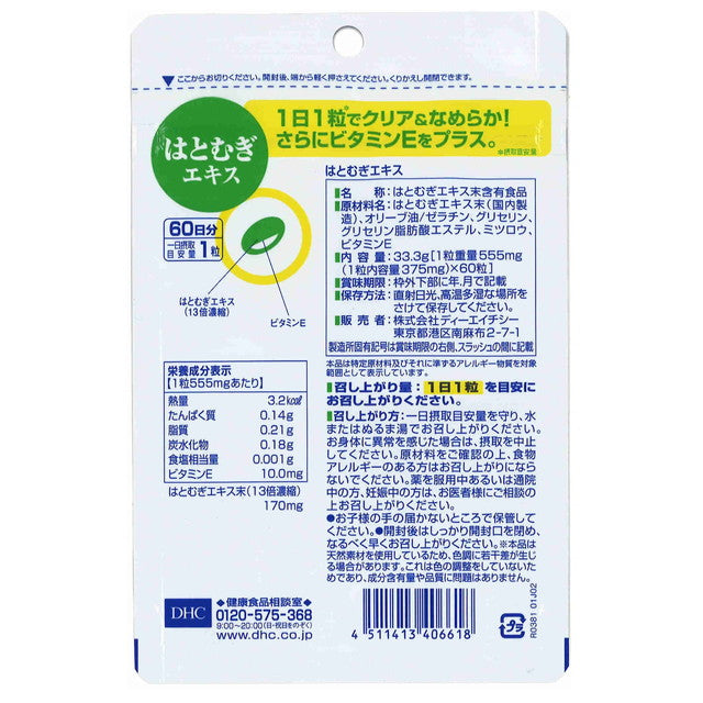 【13倍濃縮エキスで、透明感となめらかさを】 『はとむぎエキス』は、漢方では<ヨクイニン>として知られる<ハトムギ>のエキスを、13倍に濃縮配合したサプリメントです。 若ーしい美しさに役立つビタミンEもプラスし、気になるくすみやブツブツ・カサカサ対策をサポートします。 本来の力で内側から輝きたい方にオススメです。