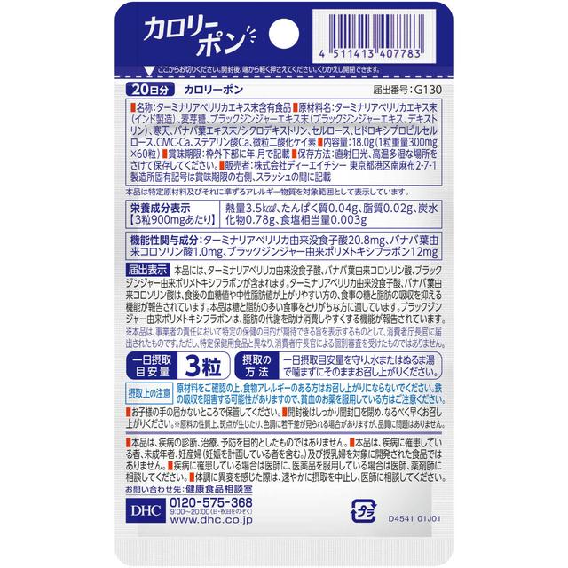 ターミナリアべリリカエキス末(インド製造)、麦芽糖、ブラックジンジャーエキス末(ブラックジンジャーエキス、デキストリン)、寒天、バナバ葉エキス末/シクロデキストリン、セルロース、ヒドロキシプロピルセルロース、CMC-Ca、ステアリン酸Ca、微粒二酸化ケイ素