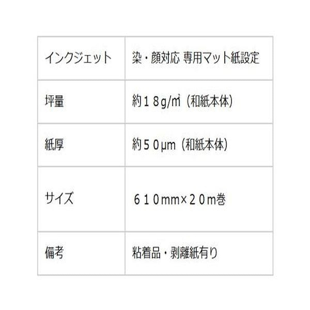 和紙のイシカワ インクジェット用粘着薄和紙 610mm×20m巻 WA009 紙厚約50μmの極薄和紙です。インクジェット用の表面加工をした強靭な薄和紙に、粘着加工処理をしました。薄和紙なのでデコボコにそいやすく、提灯に家紋や名前を貼りたいときなどにご利用いただけます。光を透過しますので他の電飾や障子のデコレーションにもお使いいただけます。