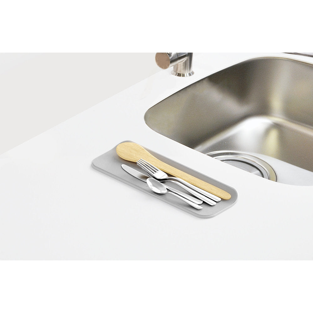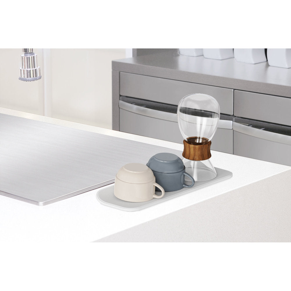 マットは食器拭きにもなり、絞ることで吸水力が回復するので乾燥を待たずにくり返しご使用頂けます。手洗いができるためお手入れも簡単です。マットに使用している超吸水スポンジは珪藻土素材をしのぐほどの吸水力で食器などを素早く乾燥させます。柔らかくクッション性があるので落としても割れることがなく、食器などを傷つける心配もありません。絞るとすぐに吸水力が戻るのがこの特殊スポンジの特量です。乾燥を待つことなく、何度でも吸水可能です。シリコーンマットに角度をつけ、通気性を高めたことで、置いた食器やコップが早く乾きます。スポンジシートは、手洗い可能です。中性洗剤も使用できるため、清潔に保つことができます。スポンジシートは簡単に取外し可能。クロスとして、濡れた調理台や洗面所を拭くこともできます。