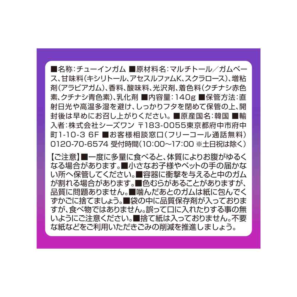 ガムベース、甘味料(キシリトール、アセスルファムK、スクラロース)、増粘剤(アラビアガム)、香料、酸味料、光沢剤、着色料(クチナシ赤色素、クチナシ青色素)、乳化剤