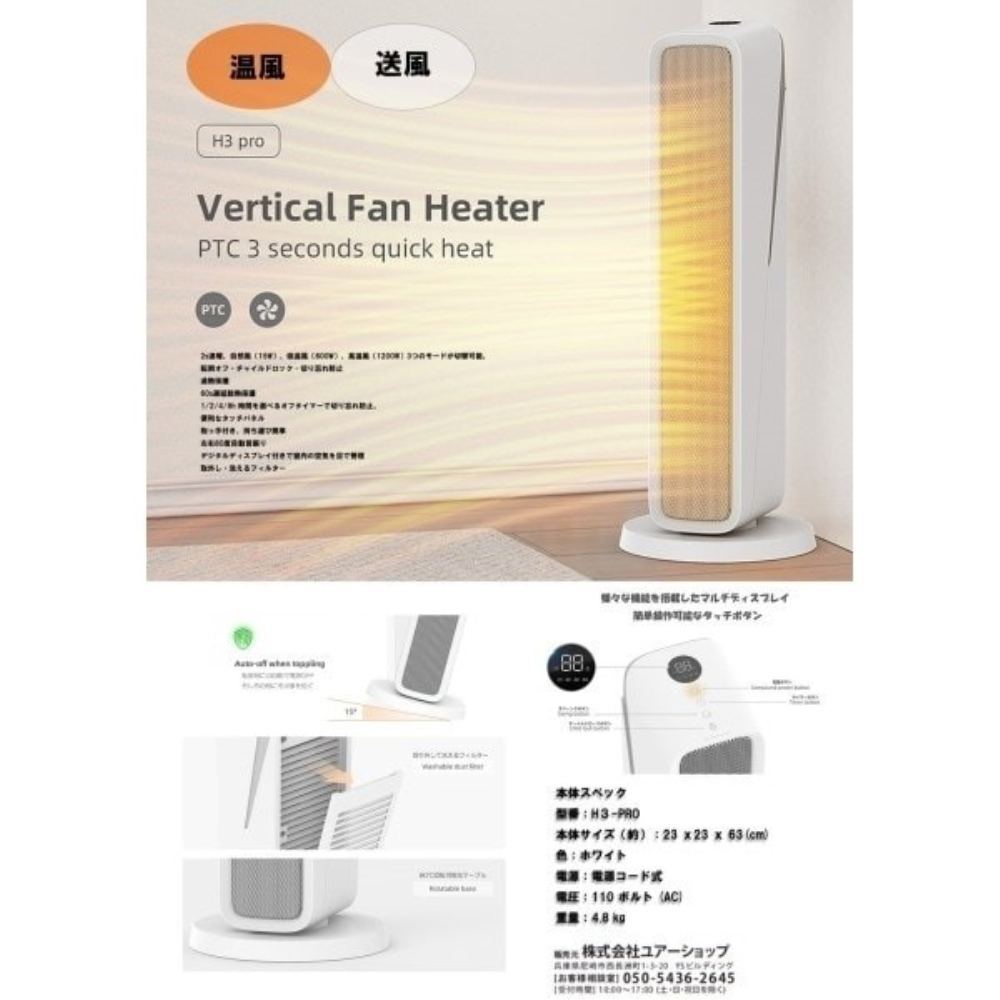 2s速暖。自然風(15W)、低温風(800W)、高温風(1200W)3つのモードが切り替え可能。多彩な機能を備えたマルチディスプレイ&タッチパネル~室内の空気を目で管理!転倒オフ・チャイルドロック・切り忘れ防止~本体が傾斜15°を超えると自動的に電源OFF!左右80度自動首振り。取外し・洗えるフィルター。過熱保護されたプレート&本体には難燃性素材を使用。