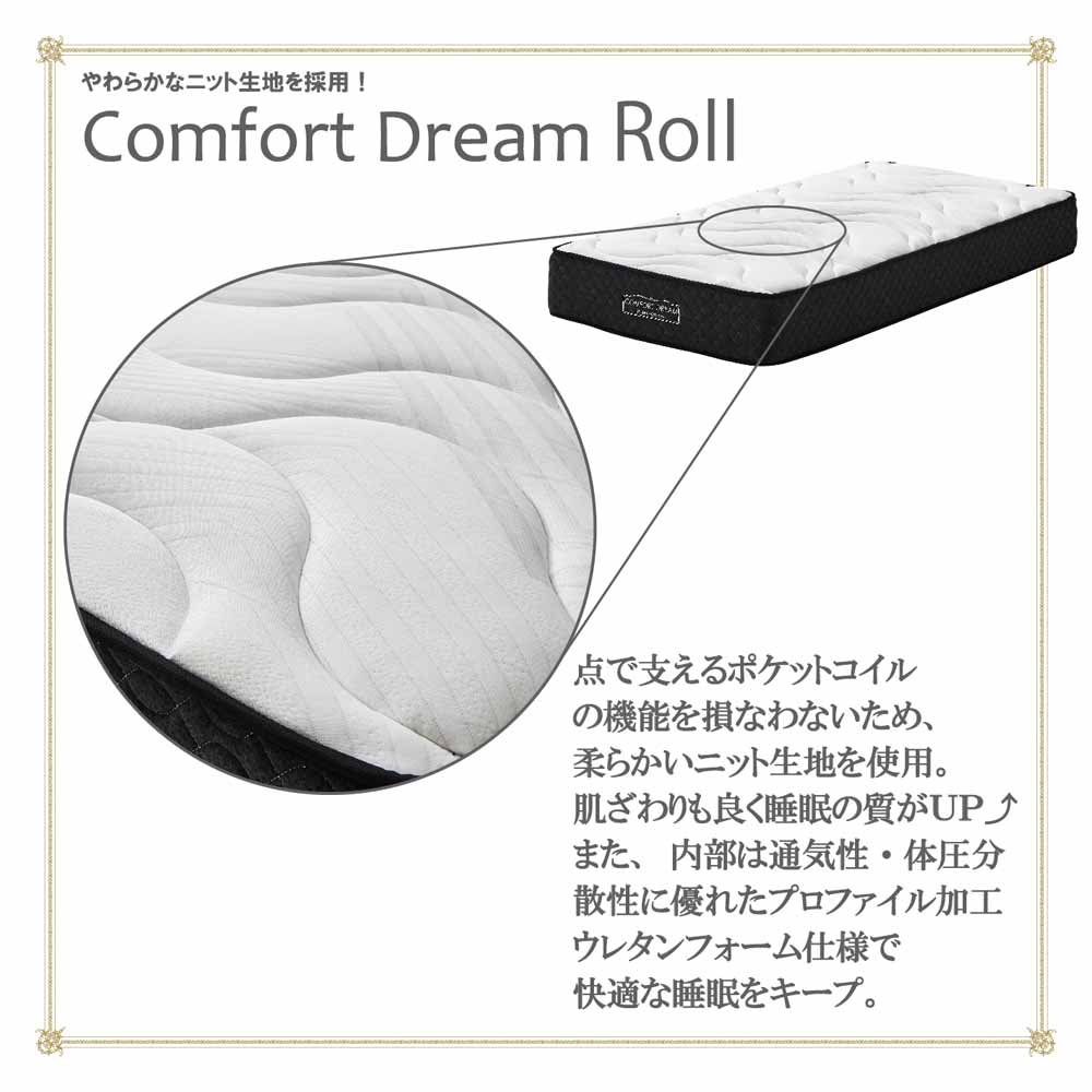 プロファイル加工ウレタンフォームを採用した快適な寝心地のポケットコイルマットレス!キングサイズ!●通気性・体圧分散性に優れたプロファイル加工ウレタンフォームを採用、快適な睡眠をキープ。●表面は、柔らかな風合いと伸縮性・吸収性に優れたニット生地を使用。●独立したポケットコイルスプリングが体圧や振動を「点」で吸収し身体にフィット。●ポケットコイルは並行配列でマットの両サイド2列は線形を硬くしマットレスの淵に座っても落ちにくいエッジサポートしシステムを採用しております。