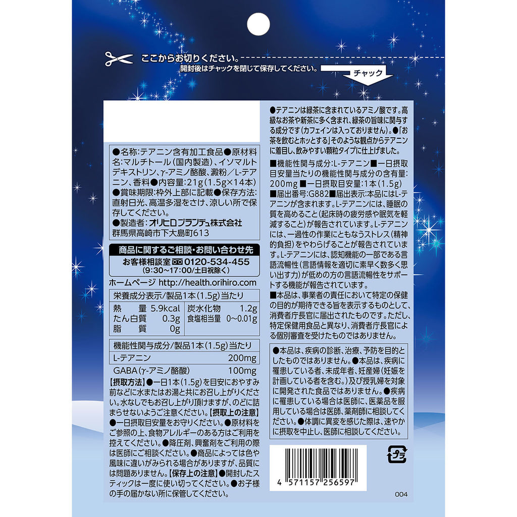 1)テアニンの機能性表示食品   テアニンは緑茶の旨味成分で、高級なお茶や新茶に豊富に含まれ、風味に寄与するだけでなく、   リラックスさせたり、眠りをサポートする機能を持つことが知られています。   本品は『朝の目覚めの疲労感の軽減』に役立つサプリとして、機能性表示を行っています。 2)水なしでも飲みやすいレモン風味   テアニンは緑茶独自の風味に寄与する成分です。   「お茶を飲むとホッとする」そのような観点からテアニンに着目し、飲みやすい製品に仕上げました。   水なしでも美味しいレモン風味の顆粒タイプです。 <届出表示> 本品にはテアニンが含まれます。テアニンには朝目覚めた時の疲労感を軽減することが報告されています。