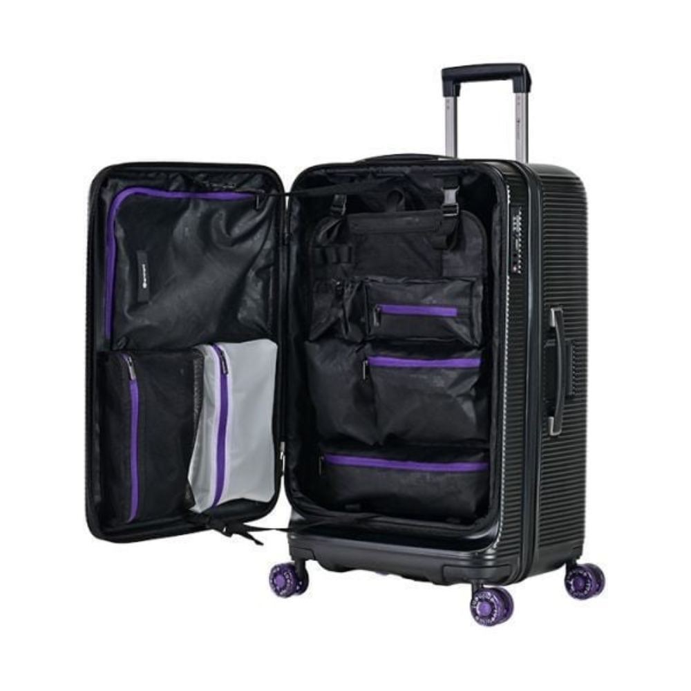 アウトドアを意識した拡張可能な多機能スーツケース。ショックアブソーバー付きキャスターを採用し移動もラクラク。取り外しできる収納で使い勝手も向上。TSAロック搭載で海外旅行も安心.TSAロック搭載で海外旅行も安心。収納比率1:9デザインにより、下部の収納スペースが深く、効率的に収納でき、空間を無駄にしません。防水収納袋と多層の収納スペースがあり、衣類、旅行用品、キャンプ用品を簡単に分類して収納できます。ショックアブソーバー付き360度回転キャスターで優れた衝撃吸収機能で引きやすさと静音性が向上。仕切り板は取り外し可能で、臨時の収納バスケットとしても使えます。最上部の2つの収納ポーチは取り外して持ち運びでき、使用の自由度が大幅にアップ。横向きに置くと、小さなテーブルに早変わり。飲み物や小物を軽く置けるようになり、テント設営や装備整理の合間にも便利です。正面には2つの円形のくぼみがあり、飲み物を置いても倒れる心配なし。背面には折りたたみ式カップホルダーがあり、飲み物や傘などを置けます。側面フック付きの足元収納で、提げバッグなどを掛けることができます。