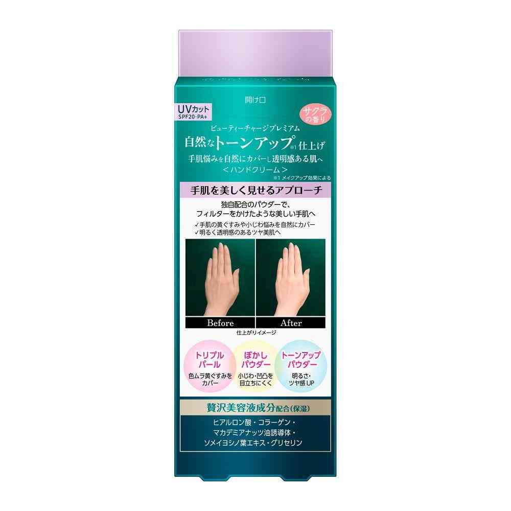 自然なトーンアップ※1仕上げ※1メイクアップ効果による○手肌を美しく見せるアプローチ○独自配合のパウダーで、フィルターをかけたような美しい手肌へ○手肌の黄ぐすみや小じわ悩みを自然にカバー○明るく透明感のあるツヤ美肌へ○トリプルパールで色ムラ黄ぐすみをカバー○ぼかしパウダーで小じわ・凹凸を目立ちにくく○トーンアップパウダーで明るさ・ツヤ感UP●UVカットSPF20・PA+●サクラの香り●贅沢美容液成分配合(保湿)ヒアルロン酸・コラーゲン・マカデミアナッツ油誘導体・ソメイヨシノ葉エキス・グリセリン●高機能美容液ハンドクリーム