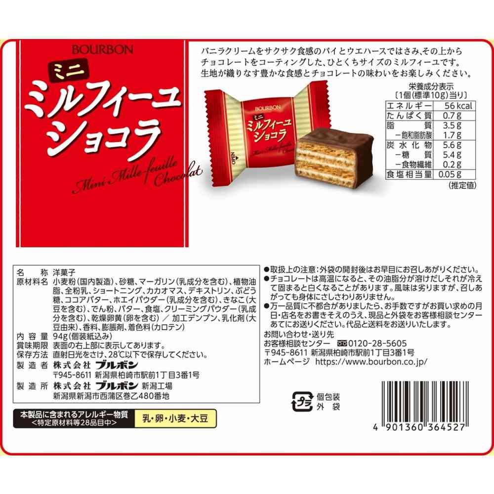 バニラクリームをサクサク食感のパイとウエハースではさみ、その上からチョコレートをコーティングした、ひとくちサイズのミルフィーユです。