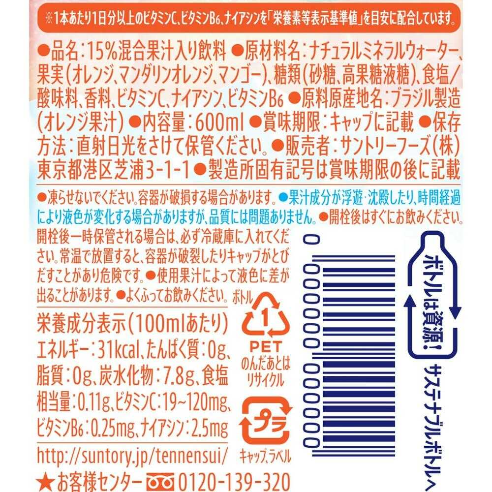 ナチュラルミネラルウォーター、果実(オレンジ、マンダリンオレンジ、マンゴー)、糖類(砂糖、高果糖液糖)、食塩/酸味料、香料、ビタミンC、ナイアシン、ビタミンB6