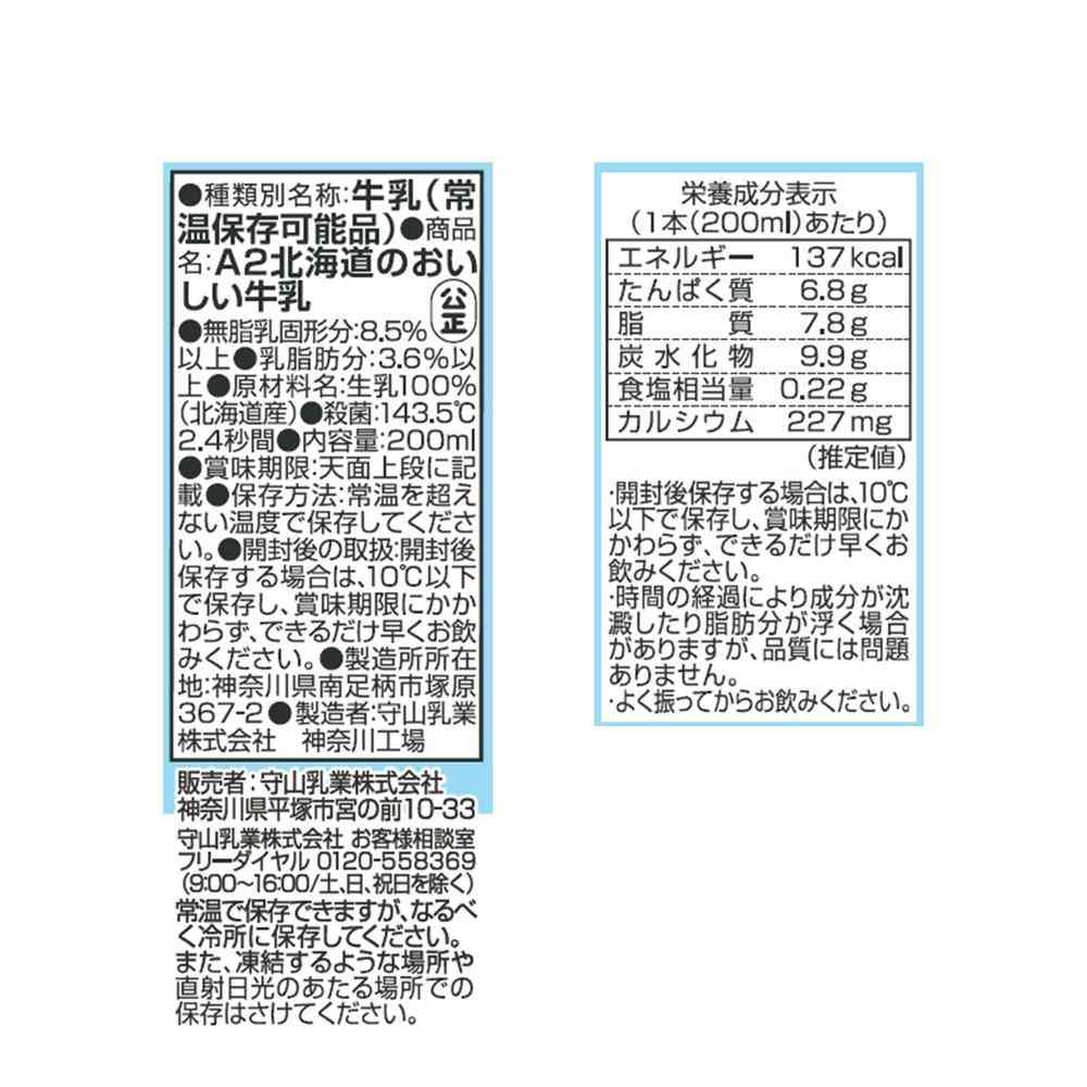 ◆守山乳業 A2 北海道のおいしい 牛乳 200ml
