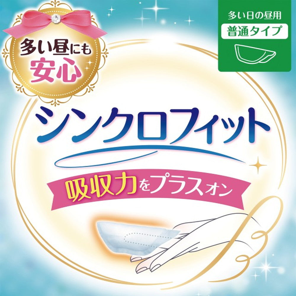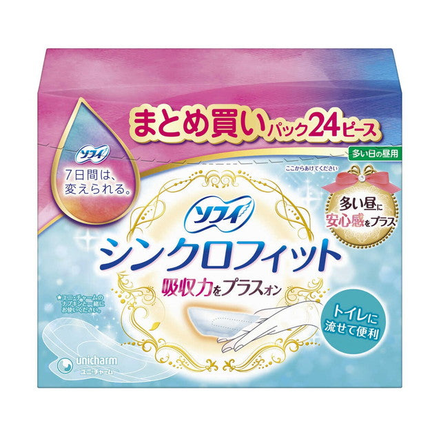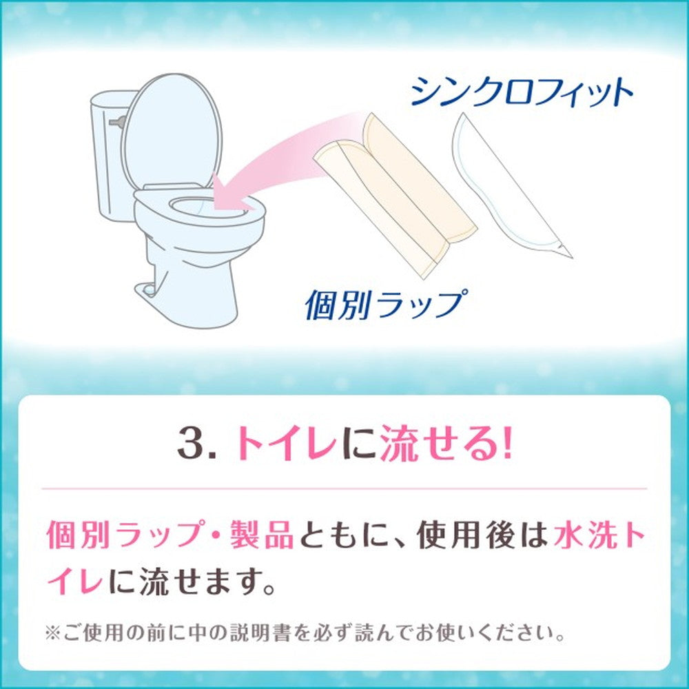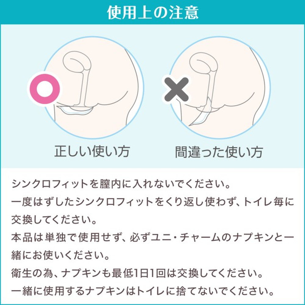 ナプキンでもタンポンでもない、第3の生理用品シンクロフィット。ナプキンとカラダの間のあのスキマにはさんで、いつものナプキンに吸収力をプラスオン。だから、自分のペースで替えられない時もモレ安心。しかもトイレに流せる。