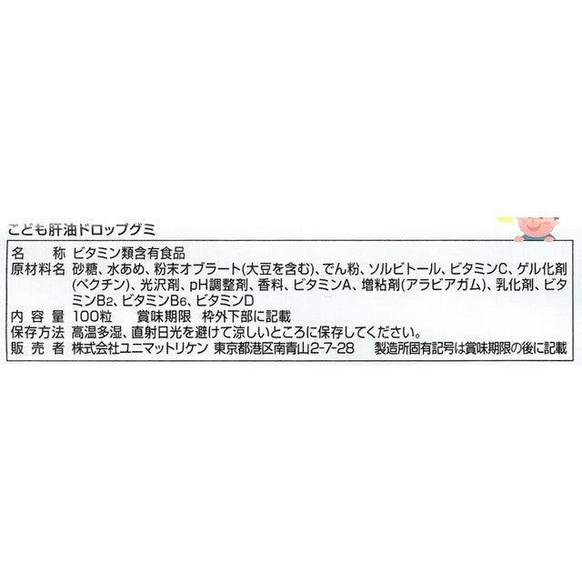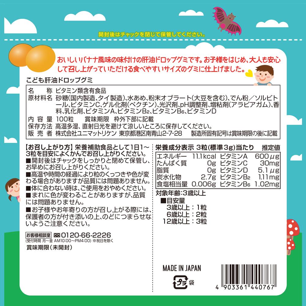 ビタミンA、ビタミンB2、ビタミンB6、ビタミンDを国の定める規格基準内で配合した栄養機能食品(V.A・V.B2・V.B6・V.D)です。おいしいバナナ風味の味付けの肝油ドロップグミで、お子様をはじめ、大人も安心して召し上がっていただける食べやすいサイズのグミに仕上げました。