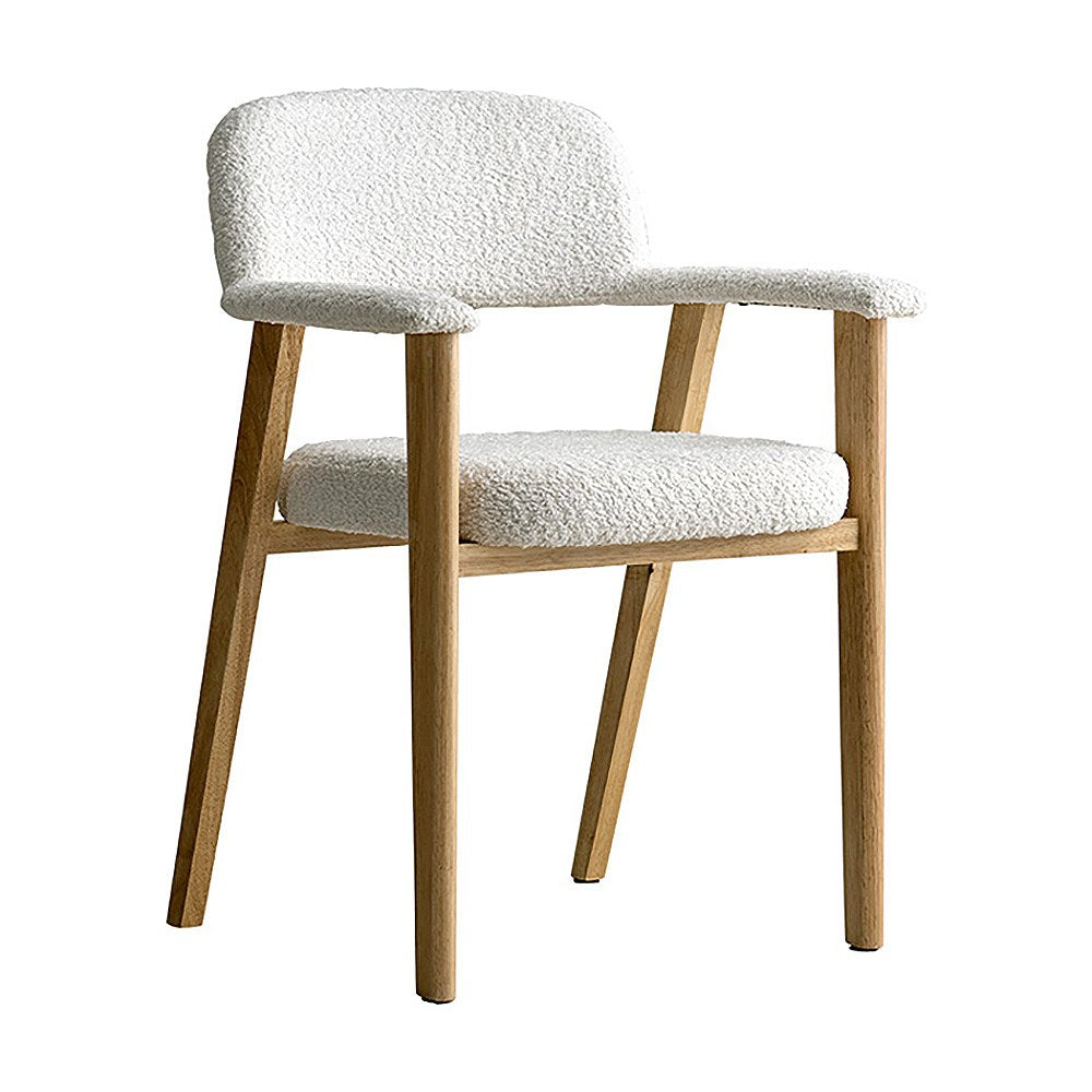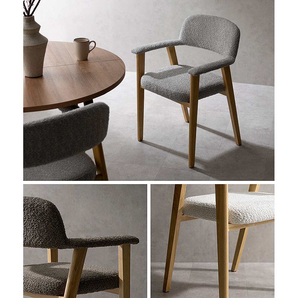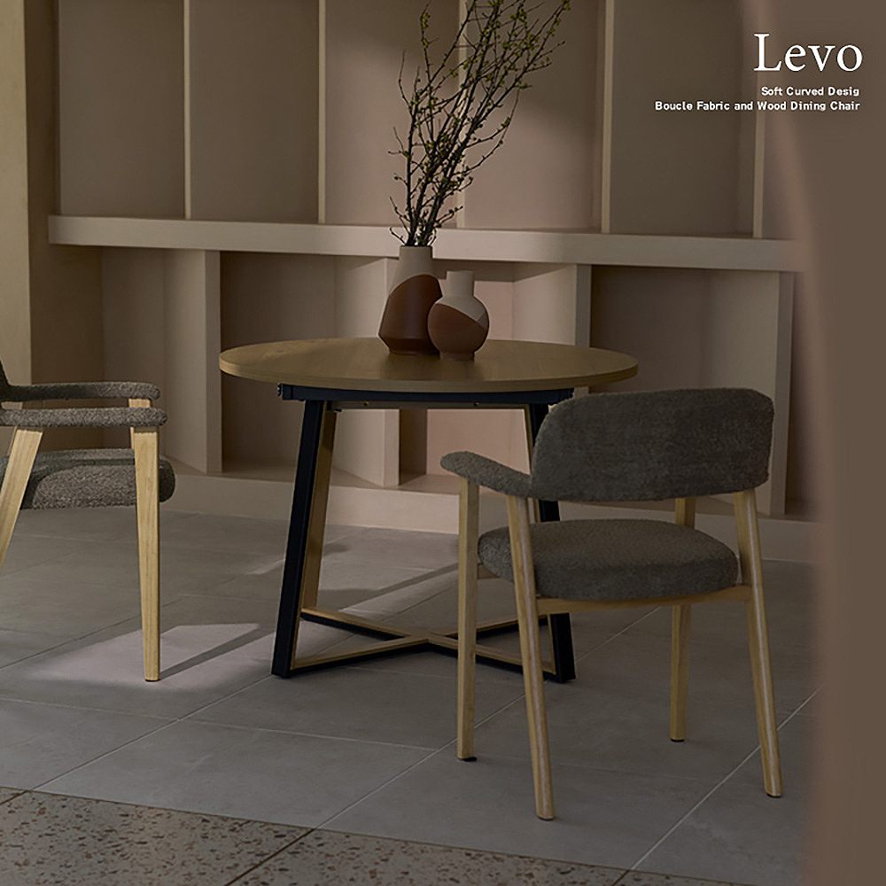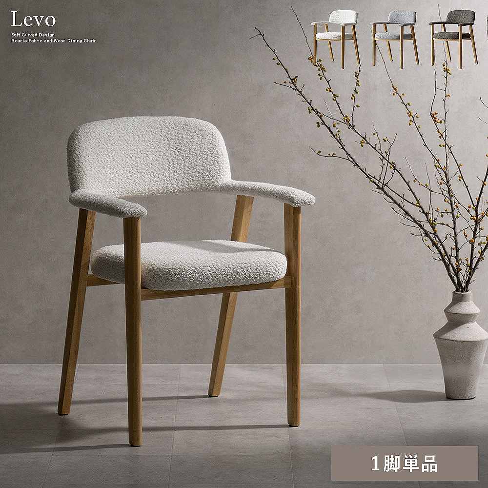 やわらかなラインが美しい、ダイニングチェア『Levo(レヴォ)』。温かな色合いの天然木素材と、光の角度によって表情を変えるブークレ生地が、上質な空間を演出。一体化した背もたれとアームが身体を包み込み、ゆったりとした座面が、長く座っても疲れにくい、快適な座り心地を実現。毎日の食卓を、より優雅で心地よいひとときへと導きます。製品重量:7.9kg