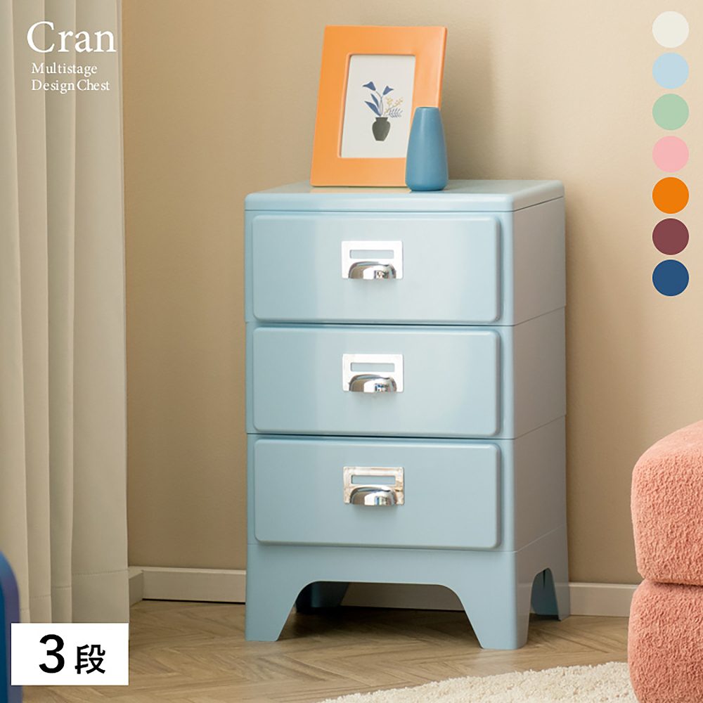 ツヤ感と丸みのあるデザインがレトロ可愛い多段チェスト『Cran(クラン)』。幅39.5cmのスリムサイズでどんな場所にも置けます。段数は2・3・5段の3タイプあり収納したい物に合わせてお選びいただけます。クリーム、ライトブルー、ライトグリーン、ピンク、オレンジ、ワイン、ネイビーの7カラー展開。お部屋のアクセントにもなります。製品重量:6.8kg