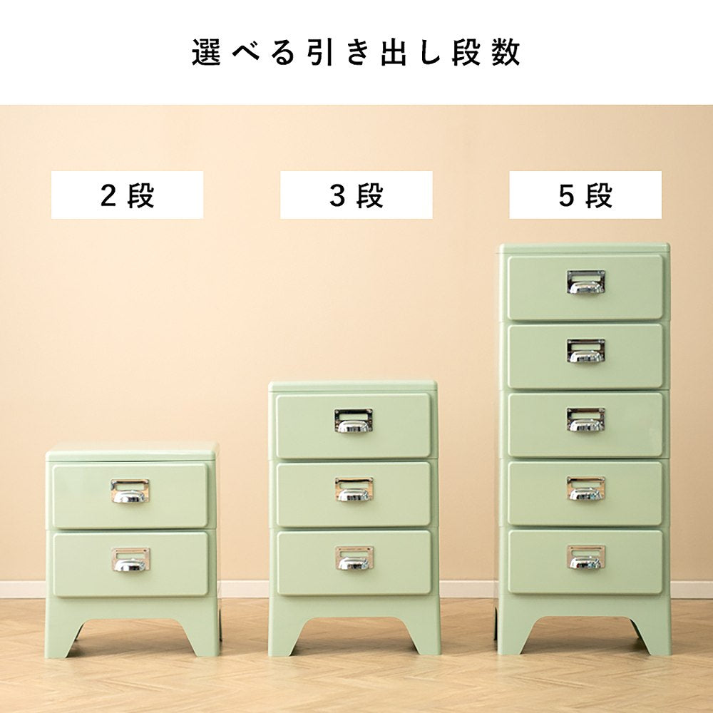 ツヤ感と丸みのあるデザインがレトロ可愛い多段チェスト『Cran(クラン)』。幅39.5cmのスリムサイズでどんな場所にも置けます。段数は2・3・5段の3タイプあり収納したい物に合わせてお選びいただけます。クリーム、ライトブルー、ライトグリーン、ピンク、オレンジ、ワイン、ネイビーの7カラー展開。お部屋のアクセントにもなります。製品重量:6.8kg