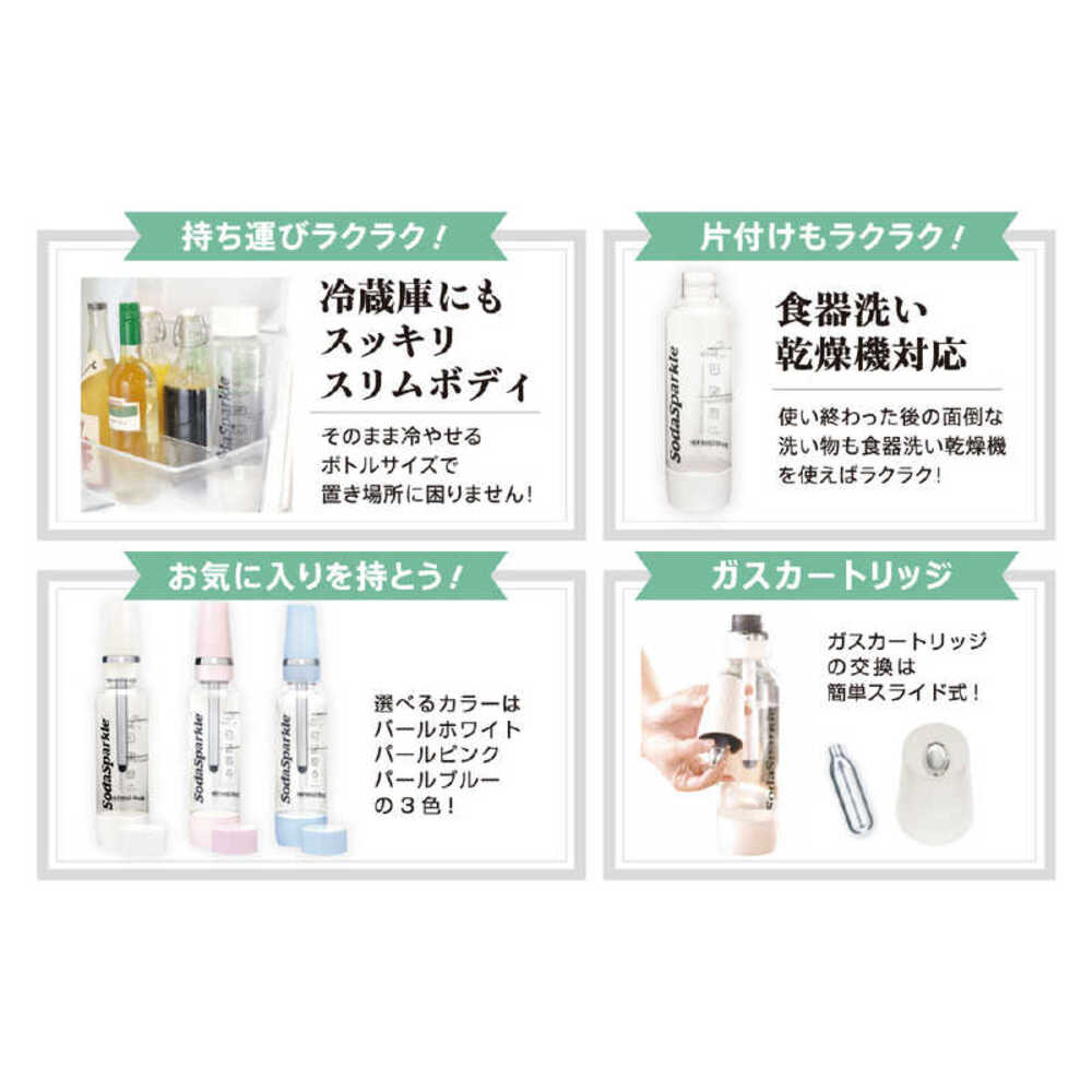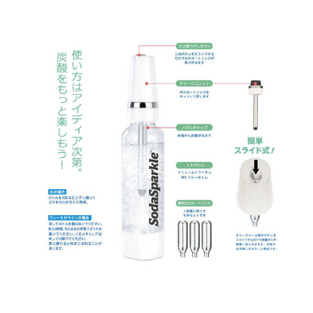 ●専用ガスカートリッジ1本で、水(1?)ジュースや白ワイン(650ml)炭酸水が作れます。