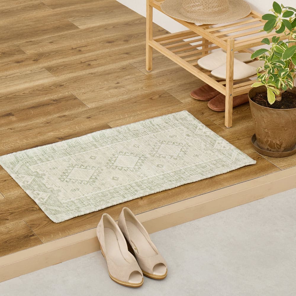 糸を毛羽立たせ柔らかな質感に仕上げたシェニール糸を使い、ジャガード織で繊細な模様を美しく表現した高級感のある一枚。 やさしい色合いだから軽やかで、今どきのインテリアにも気軽に取り入れられるデザインです。掃除機もかけやすく、毛足が短いためゴミが溜まりにくいから日々のお手入れも簡単。裏面はラバー素材で、滑り止め効果がありズレにくいのも嬉しいポイントです。