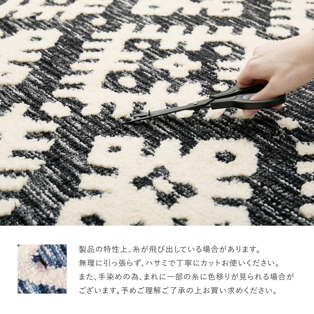製品の特性上、糸が飛び出している場合がございます。無理に引っ張らず、ハサミで丁寧にカットしてお使いください。また、手染めのため、まれに一部の糸に色移りが見られる場合がございます。