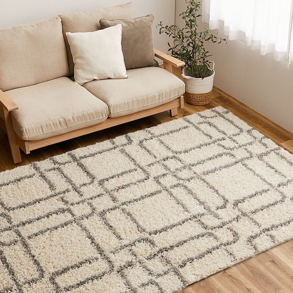 エジプト製のウィルトン織シャギーラグ。おしゃれなモダン柄とナチュラルなカラーでどんなインテリアにも合わせやすいデザインです。毛足が長くボリュームがあり、おもわず寝転びたくなるような心地良さの、ふわふわとやわらかな肌触り。また、ウィルトンラグはパイルの密度が高く耐久性に優れ、お気に入りのラグを長く使いたい方にもおすすめです。