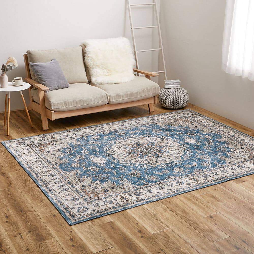 小さな模様や、ヴィンテージのようなかすれ感を細部までプリントで表現した、まるで高級ラグのような一枚。