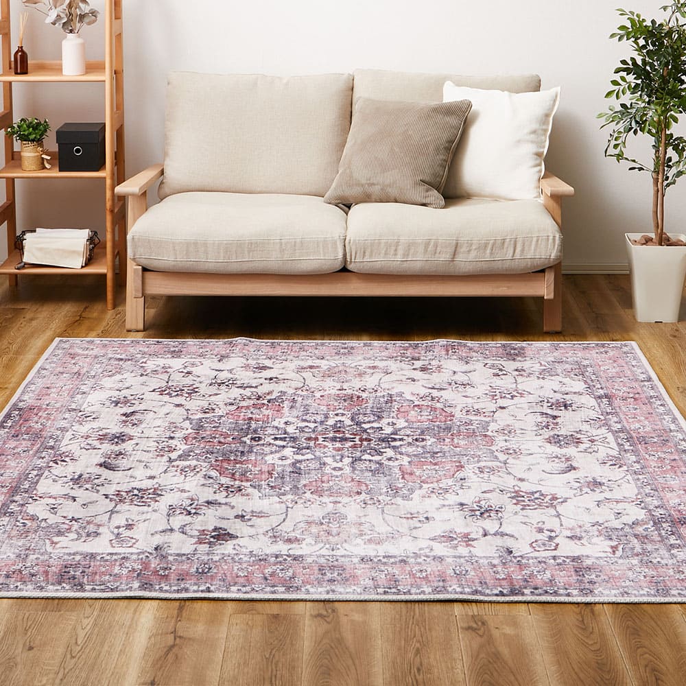 小さな模様や、ヴィンテージのようなかすれ感を細部までプリントで表現した、まるで高級ラグのような一枚。