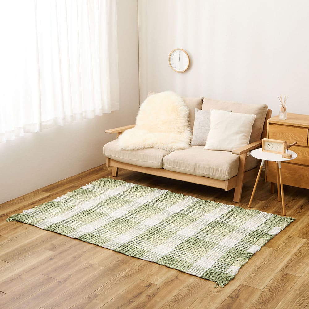 やわらかい糸を立体的に織り込んだワッフル風のぽこぽこ触感。コットンのサラッとしたタッチと、ポリエステルの乾きやすさ、ふたつの素材の特徴を活かした使いやすいラグマットです。汚れたら洗濯機で洗えるのも嬉しいポイント。さわやかなギンガムチェックのデザインで、インテリアのアクセントにぴったりなアイテムです。