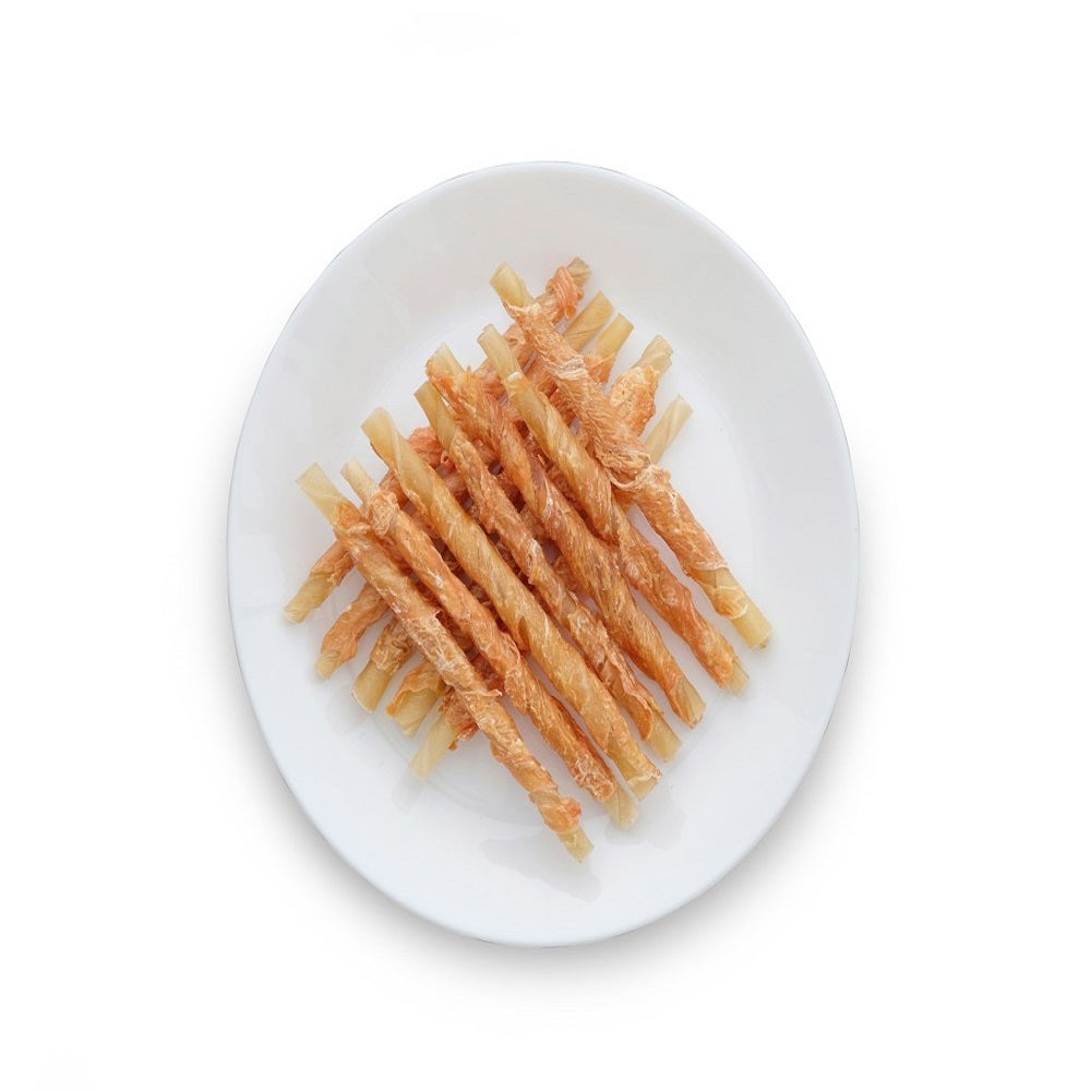 ガムをささみで巻いた長くしっかり噛めるささみ巻きジャーキーです。農林水産省より指定加熱処理施設として認定された工場で製造しています。温度、衛生管理などの指定基準をクリアした工場で生産を行い、品質にこだわったジャーキーです。